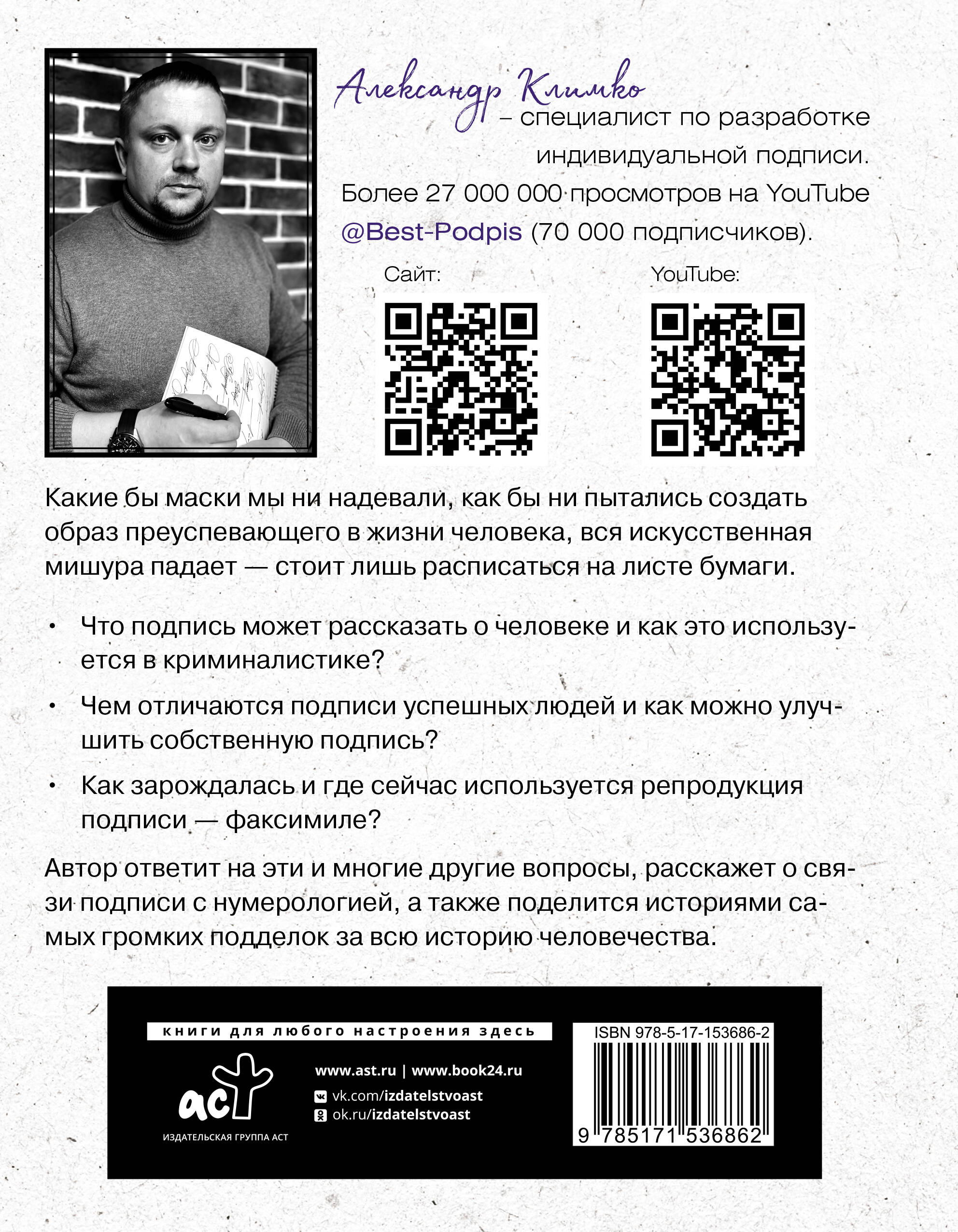 Какие бы маски мы ни надевали, как бы ни пытались создать образ преуспевающего в жизни человека, вся искусственная мишура падает - стоит лишь расписаться на листе бумаги. • Что подпись может рассказать о человеке и как это используется в криминалистике? • Чем отличаются подписи успешных людей и как можно улучшить собственную подпись? • Как зарождалась и где сейчас используется репродукция подписи - факсимиле? Автор ответит на эти и многие другие вопросы, расскажет о связи подписи с нумерологией, а также поделится историями самых громких подделок за всю историю человечества.| Издательство | ИЗДАТЕЛЬСТВО "АСТ" |
