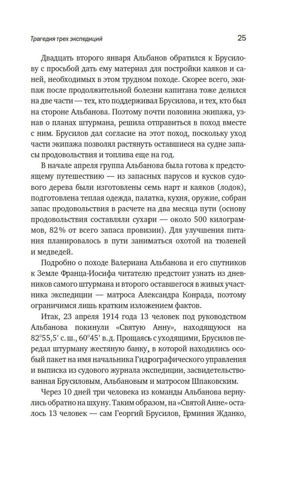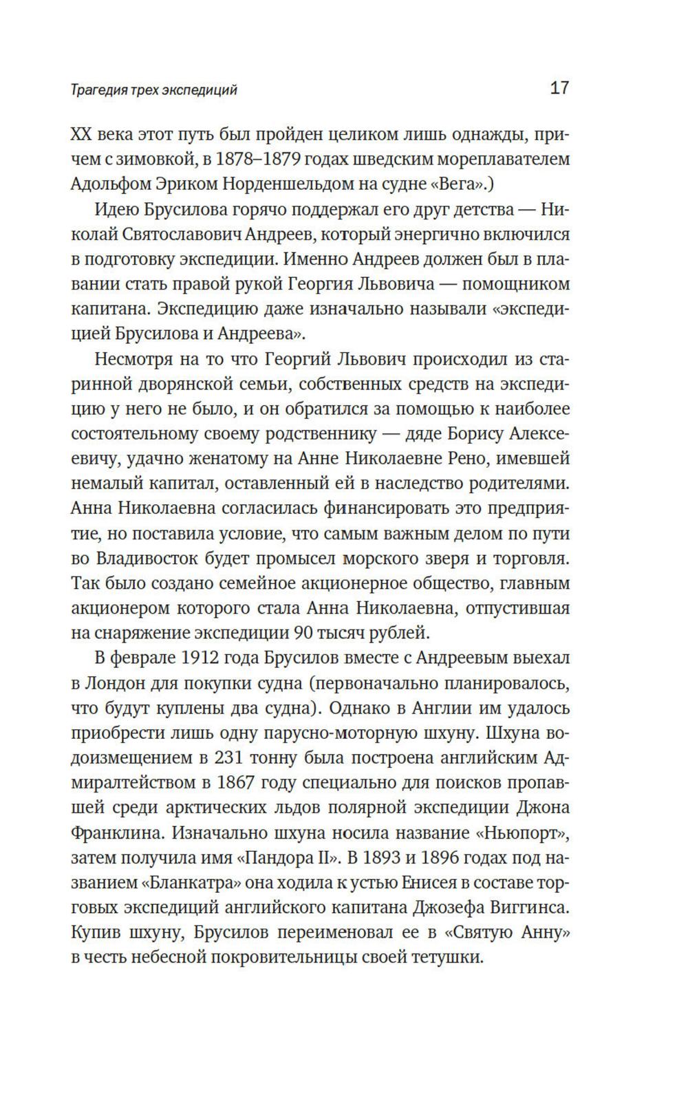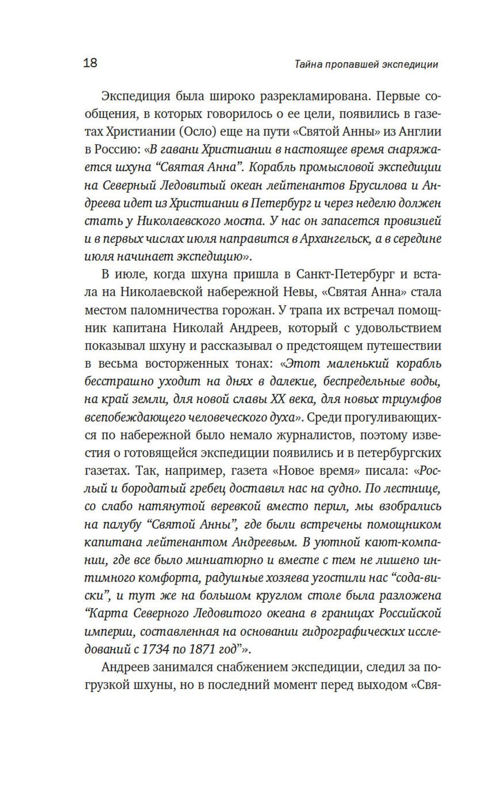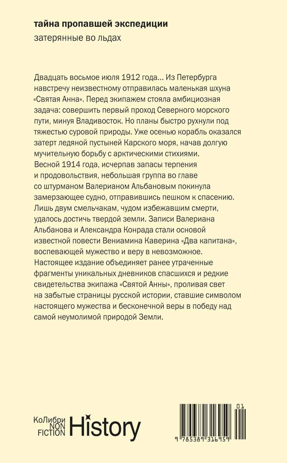 История одной из первых экспедиций, участвовавших в освоении русской Арктики полна ярких и драматических страниц. Вышедшая из Санкт-Петербурга в июле 1912 года шхуна «Святая Анна» уже в октябре оказалась зажатой во льдах Карского моря, стремительно относимых течением на север, к Новой Земле. Не сумев вырваться из ледяной ловушки, часть экипажа решилавернуться на материк. Путь занял четыре месяца вместо предполагаемого одного. Из одиннадцати человек, покинувших судно в апреле 1914 года, до Земли Франца-Иосифадошли только двое, штурман Валериан Альбанов и матрос Александр Конрад. Это издание впервые объединяет оба свидетельства выживших членов экипажа «Святой Анны».| Издательство | КоЛибри |