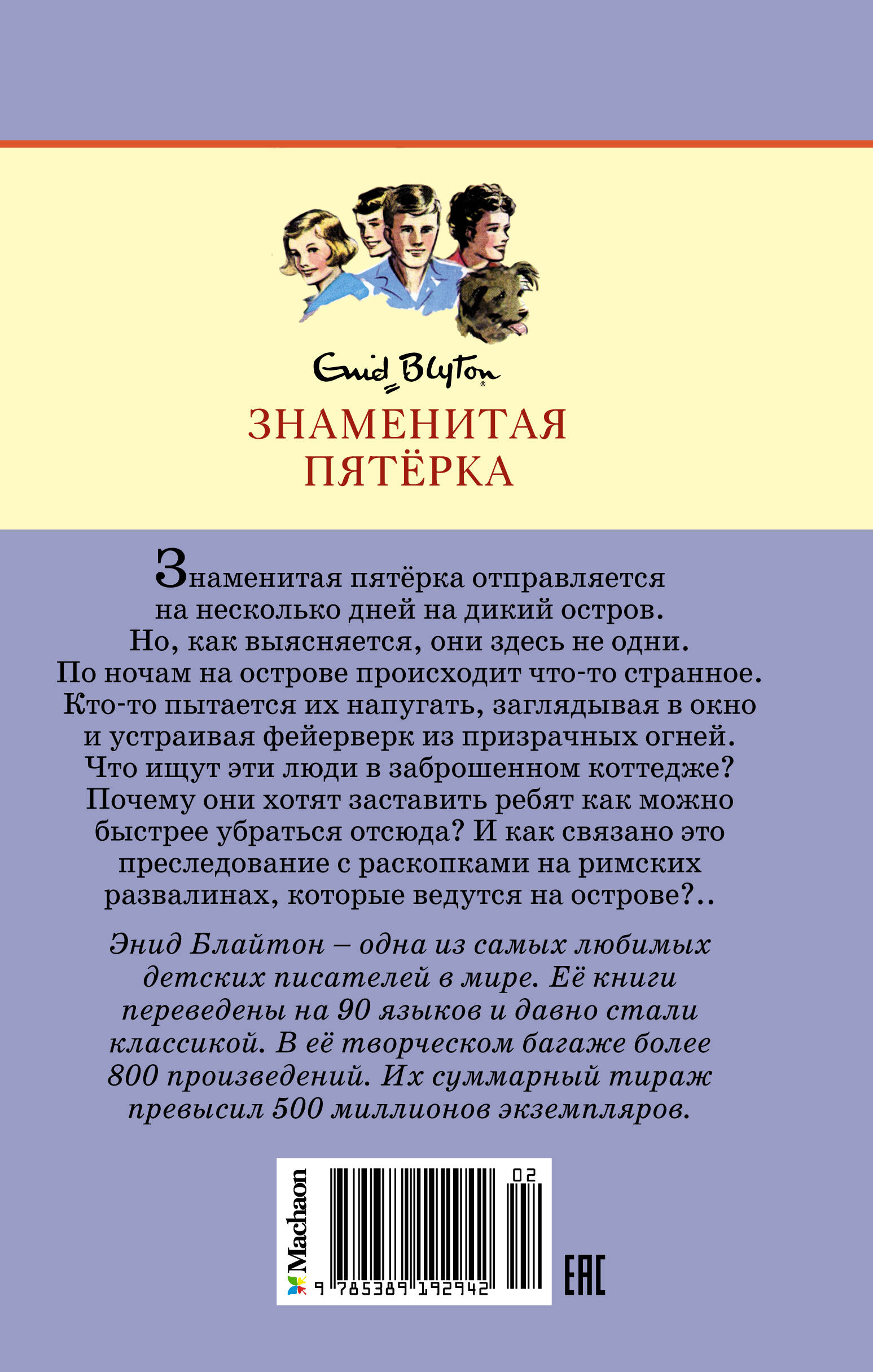 Знаменитая пятёрка отправляется на несколько дней на дикий остров. Но, как выясняется, они здесь не одни. По ночам на острове происходит что-то странное. Кто-то пытается их напугать, заглядывая в окно и устраивая фейерверк из призрачных огней. Что ищут эти люди в заброшенном коттедже? Почему они хотят заставить ребят как можно быстрее убраться отсюда? И как связано это преследование с раскопками на римских развалинах, которые ведутся на острове?..| Издательство | Азбука-Аттикус Издат.группа ООО |