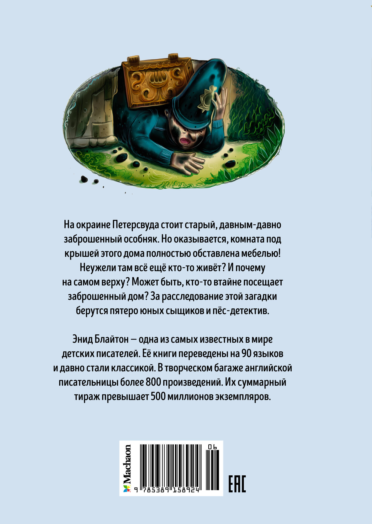 На окраине Петерсвуда стоит старый, давным-давно заброшенный особняк. Но оказывается, комната под крышей этого дома полностью обставлена мебелью! Неужели там всё ещё кто-то живёт? И почему на самом верху? Может быть, кто-то втайне посещает заброшенный дом? За расследование этой загадки берутся пятеро юных сыщиков и пёс-детектив.| Издательство | Азбука-Аттикус Издат.группа ООО |