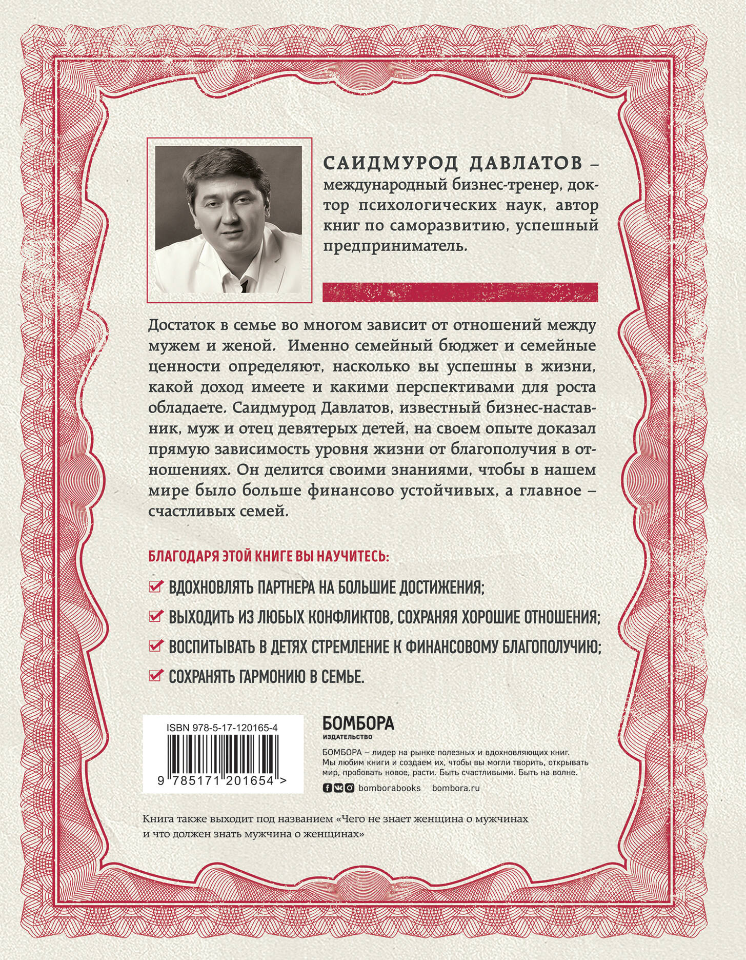 Об авторе Саидмурод Давлатов - доктор психологических наук, эксперт по отношениям между мужчиной и женщиной, автор одноименного курса тренингов по улучшению семейных отношений «Что не знает женщина о мужчинах, и что должен знать мужчина о женщинах»-1 и 2. Его тренинги прошли более 1 200 000 человек из стран СНГ, онлайн и оффлайн. По результатам тренингов, благодаря специальным практическим методикам, многие сумели сохранить семью, наладить родственные отношения, изменить мышление, избавиться от стереотипов и начать новую жизнь. 7 ПРИЧИН ПРОЧИТАТЬ ЭТУ КНИГУ 1. Станете мастером общения и научитесь понимать язык любви мужчин и женщин. 2. Научитесь вдохновлять мужчину на большие достижения и великие подвиги. 3. Обретете мудрость, которая поможет выйти из любого конфликта и при этом сохранить семью. 4. Используя полученные знания, сможете лучше понять семейные законы будущего мужа/жены. Это позволит правильно выбрать спутника(цу) жизни. 5. Книга поможет женщинам стать более востребованными у мужчин. 6. Овладеете методикой воспитания гениальных детей. 7. Узнав многие секреты из книги, станете самой сексуальной женщиной/мужчиной, что поможет сохранить гармонию в семье.| Издательство | ООО "Издательство "Эксмо" |