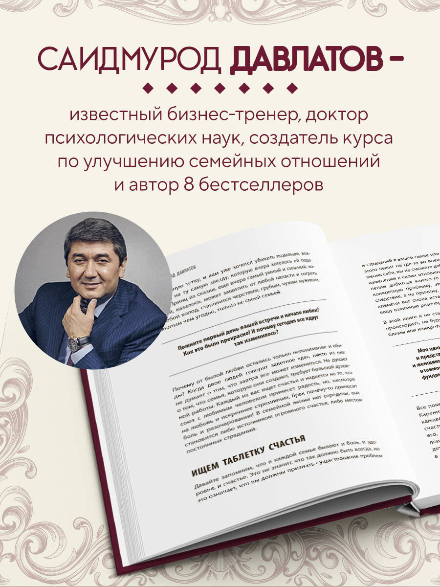Об авторе Саидмурод Давлатов - доктор психологических наук, эксперт по отношениям между мужчиной и женщиной, автор одноименного курса тренингов по улучшению семейных отношений «Что не знает женщина о мужчинах и что должен знать мужчина о женщинах» -1 и 2. Его тренинги прошли более 1 200 000 человек из стран СНГ, онлайн и оффлайн. По результатам тренингов, благодаря специальным практическим методикам, многие сумели сохранить семью, наладить родственные отношения, изменить мышление, избавиться от стереотипов и начать новую жизнь.| Издательство | ООО "Издательство "Эксмо" |
