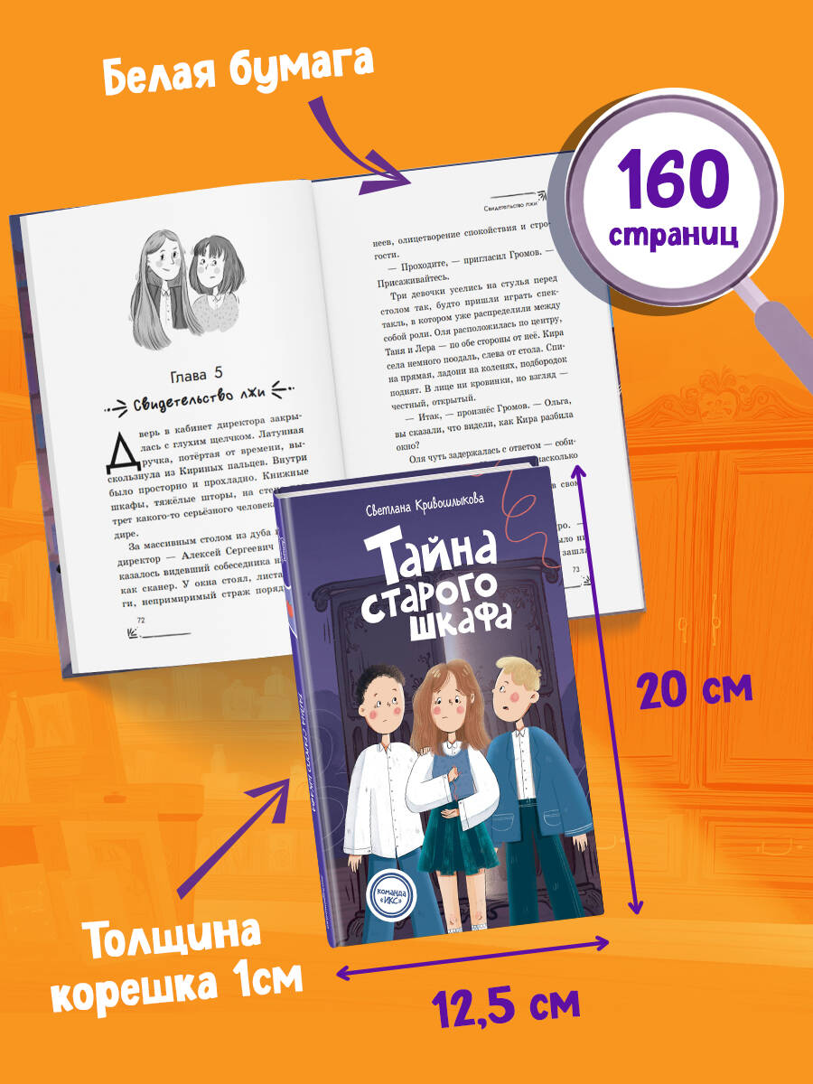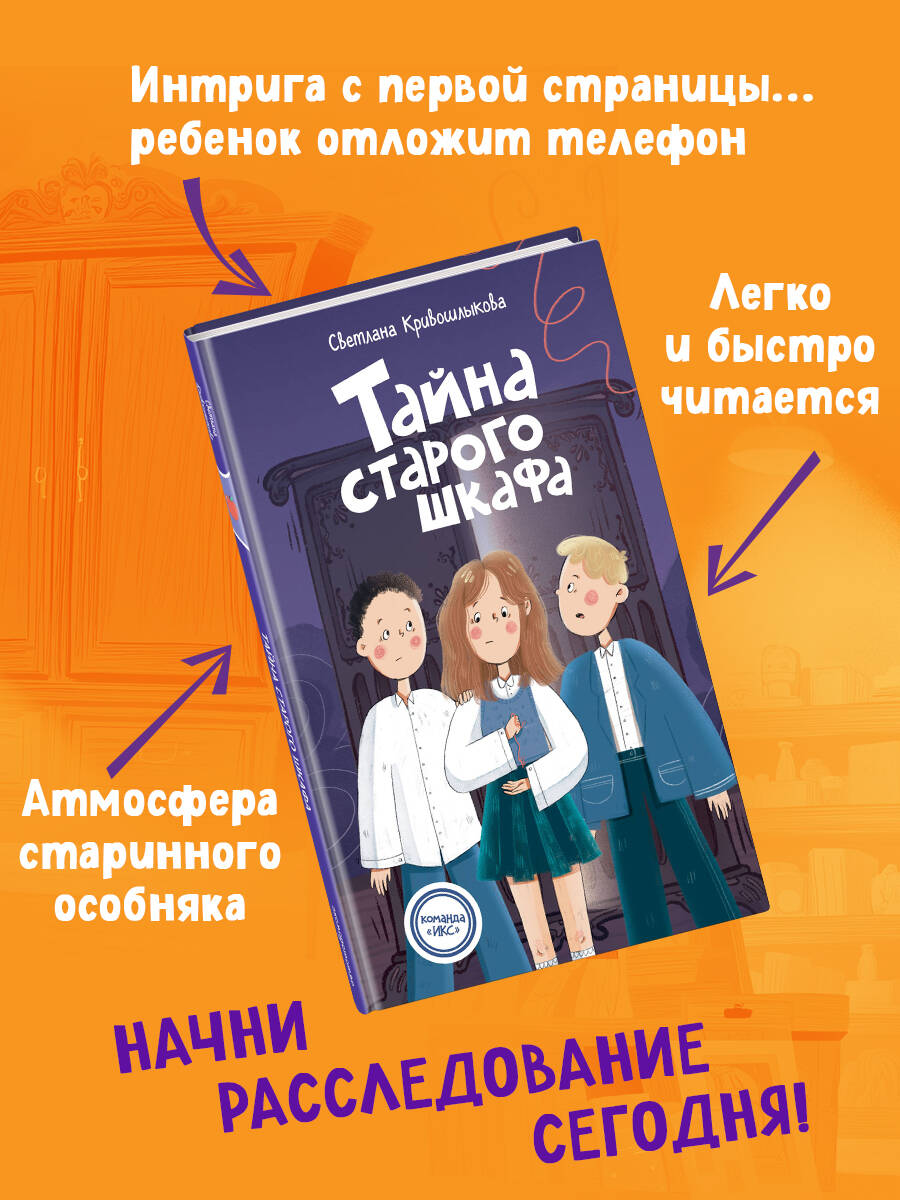 Новая детективная серия для поклонников «Чёрного котёнка» и «Мейзи Хитчинс»! Добро пожаловать в школу-пансион с вековой историей, где за старинными стенами скрываются самые необычные тайны! Трое друзей - Илья, Кира и Сашка - объединяются в команду «ИКС», чтобы расследовать загадочные события. Они учатся, дружат, ссорятся и мирятся… а ещё - берутся за дела, от которых даже у учителей бегут мурашки! Когда Кира и её друзья из команды «ИКС» находят в школе потайную лабораторию купца Платонова, они становятся героями дня. Но не для всех. Таня, Лера и Оля - старшеклассницы, привыкшие быть в центре внимания, - не собираются мириться с тем, что новенькая затмила их. Всё начинается с мелких пакостей: кражи еды, насмешек, подколов. Но вскоре Киру обвиняют в разбитом окне, и теперь ей грозит исключение. Отец, строгий офицер ФСБ, уже едет в школу… Тем временем старый шкаф в учительской скрывает нечто большее, чем просто полки. Действие историй разворачивается в уникальном месте - школе-пансионе, расположенном в бывшей купеческой усадьбе девятнадцатого века. Автор серии Светлана Кривошлыкова мастерски описала загадочную атмосферу старинного здания и тайны, хранящиеся в нём. Соединение духа закрытого пансиона с современной жизнью обычных школьников делает чтение увлекательным, а раскрытие тайн - запоминающимся. История внутри каждой книги закончена: одна книга - одна загадка. Книги серии можно читать как отдельно друг от друга, так и вместе. Книги рассчитаны на детей от 8 лет и старше. Подойдут для внеклассного чтения. Ребёнок не устанет читать: в книгах крупный шрифт, белая бумага, запоминающееся оформление.| Издательство | ООО "Издательство "Эксмо" |