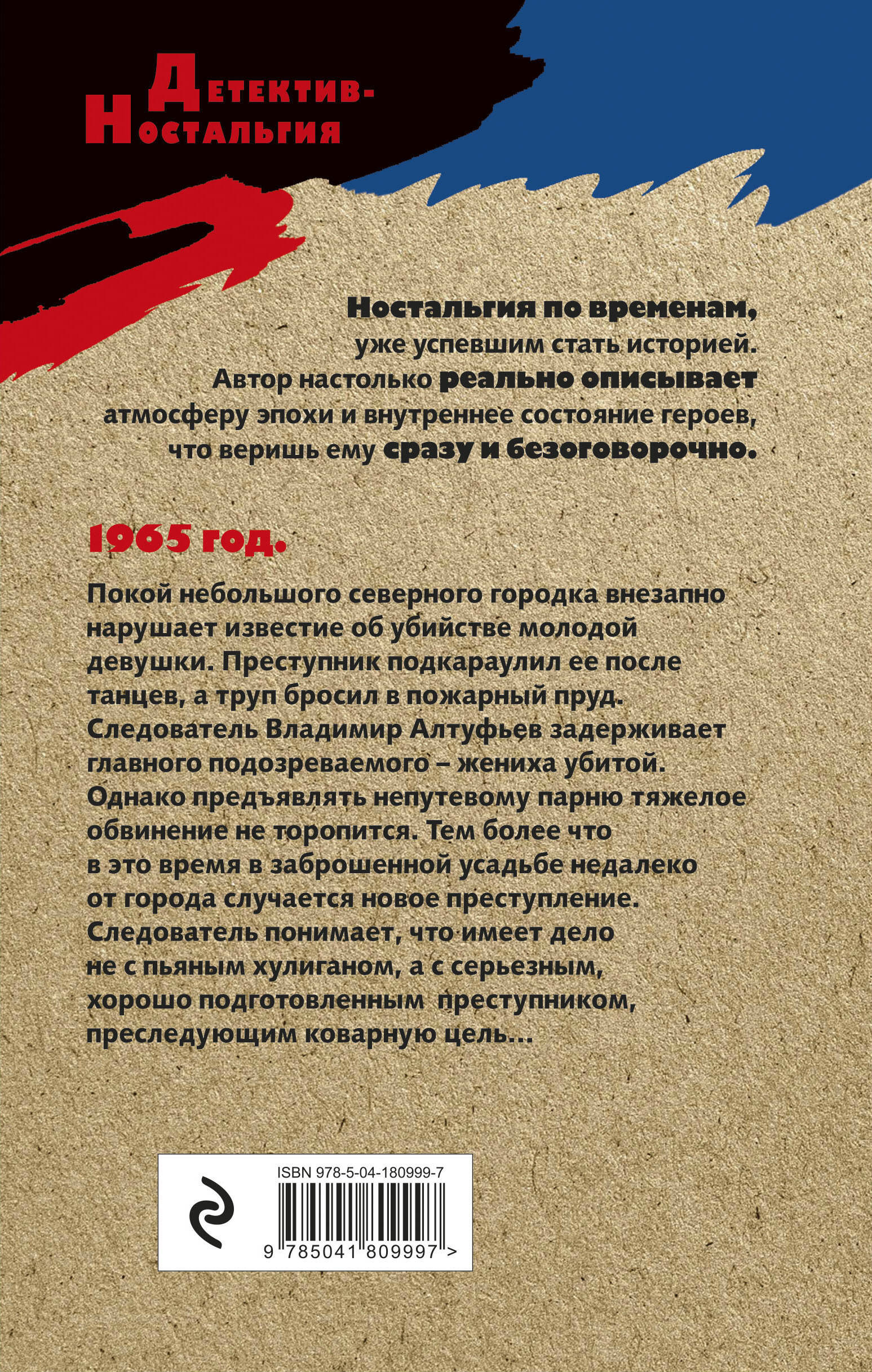 Ностальгия по временам, уже успевшим стать историей. Автор настолько реально описывает атмосферу эпохи и внутреннее состояние героев, что веришь ему сразу и безоговорочно. 1965 год. Покой небольшого северного городка внезапно нарушает известие об убийстве молодой девушки. Преступник подкараулил ее после танцев, а труп бросил в пожарный пруд. Следователь Владимир Алтуфьев задерживает главного подозреваемого - жениха убитой. Однако предъявлять непутевому парню тяжелое обвинение не торопится. Тем более что в это время в заброшенной усадьбе недалеко от города случается новое преступление. Следователь понимает, что имеет дело не с пьяным хулиганом, а с серьезным, хорошо подготовленным преступником, преследующим коварную цель… Уникальная возможность на время вернуться в недавнее прошлое и в ощущении полной реальности прожить вместе с героями самый отчаянный отрезок их жизни.| Издательство | ООО "Издательство "Эксмо" |