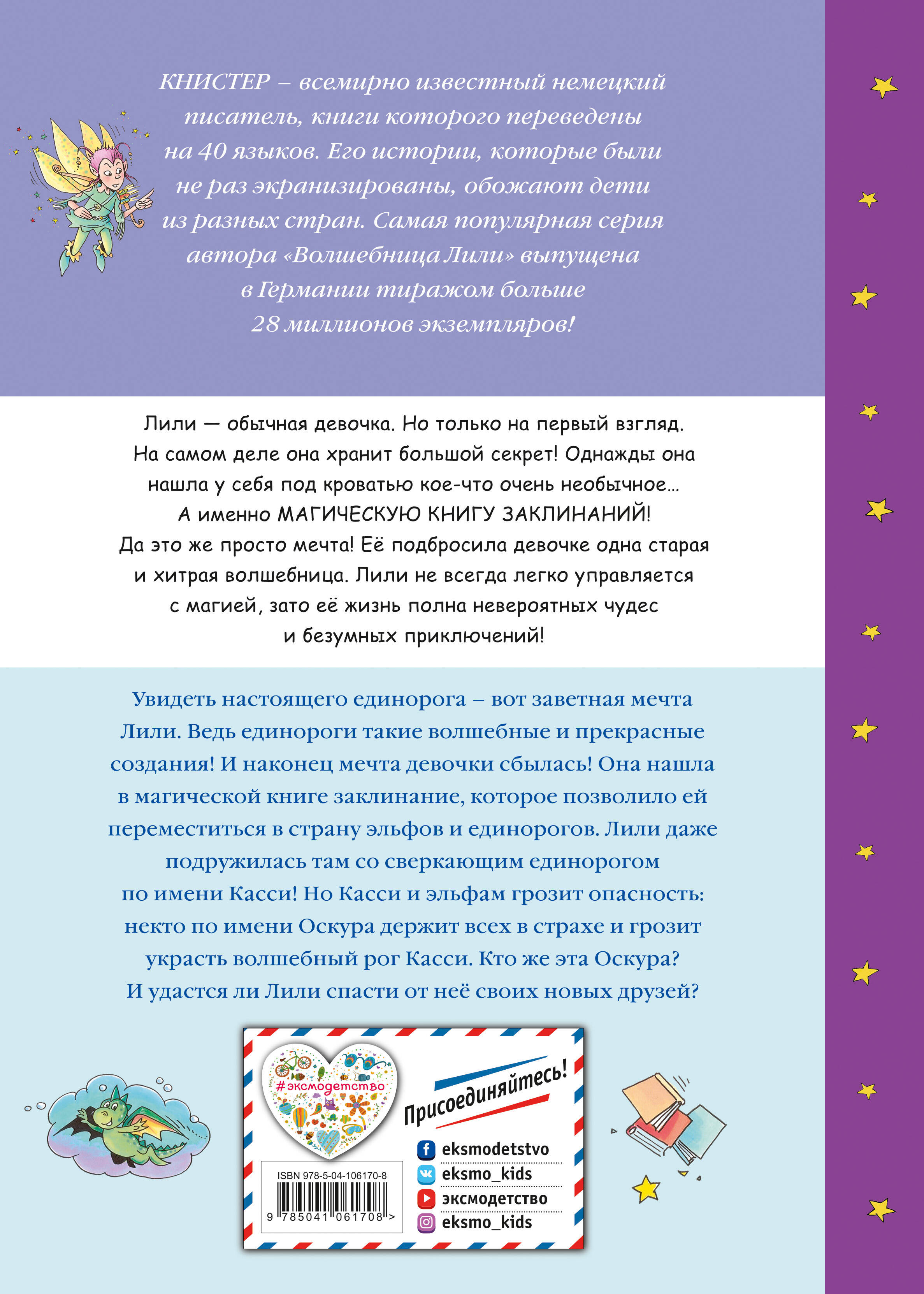 Увидеть настоящего единорога - вот заветная мечта Лили. Ведь единороги такие волшебные и прекрасные создания! И наконец мечта девочки сбылась! Она нашла в магической книге заклинание, которое позволило ей переместиться в страну эльфов и единорогов. Лили даже подружилась там со сверкающим единорогом по имени Касси. Но Касси и эльфам грозит опасность: некто по имени Оскура держит всех в страхе и грозит украсть волшебный рог Касси. Кто же эта Оскура? И удастся ли Лили спасти от неё своих новых друзей? Книстер - всемирно известный немецкий писатель, которого обожают дети в разных странах и на разных континентах. Книги о волшебнице Лили уже стали современной классикой детской литературы. Они переведены на 40 языков, а их тираж в Германии превысил 25 миллионов экземпляров. Крупный шрифт и цветные иллюстрации - читать эту книгу будет легко и интересно! Добро пожаловать в мир магии и волшебства!| Издательство | ООО "Издательство "Эксмо" |