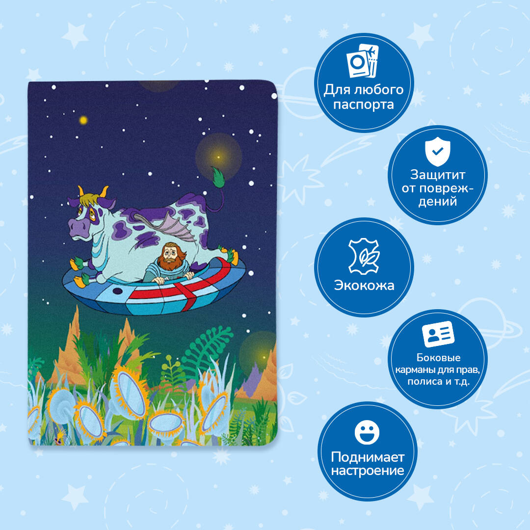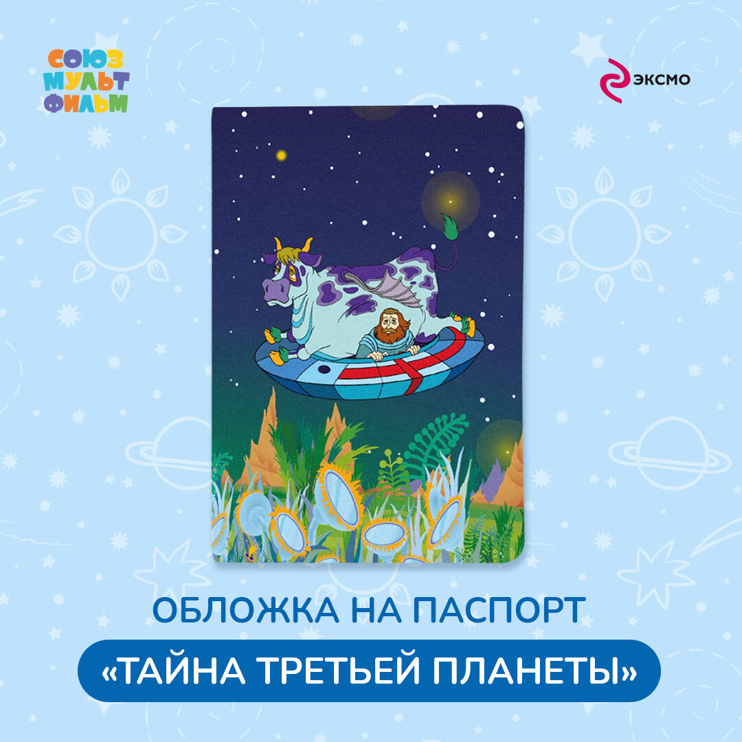 Космическая обложка на паспорт по научно-фантастическому мультфильму «Тайна третьей планеты». Большие и маленькие любители далеких-далеких галактик останутся в восторге. Внимание! Обложка на паспорт вызывает ностальгию. Рекомендуем дарить детям и взрослым всех возрастов. Обложка подходит для отечественного и заграничного паспорта. Ее размер в закрытом виде 9,35х13,5 см, а в открытом - 18,7х13,5 см. Материал ПВХ. Обложка защитит ваш паспорт от повреждений, а также скрасит походы в МФЦ, налоговую и ожидание в очереди на регистрацию на рейс. Банковские карты, СНИЛС, полис, фотографии любимых, водительские права - все уместится в боковых карманах паспорта. Обложка для паспорта сделана ко Дню космонавтики и премьере фильма «Сто лет тому вперед» («Гостья из будущего»). Главные роли исполнили: Константин Хабенский, Александр Петров, Федор Бондарчук.