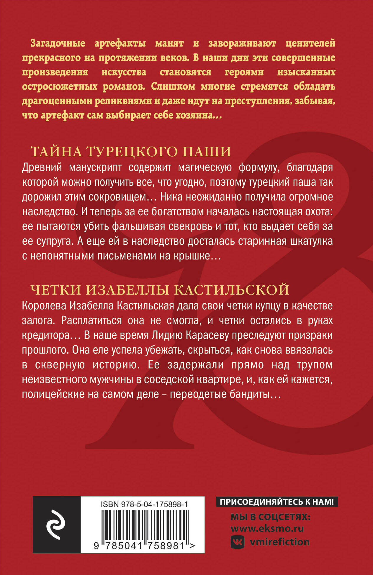 «Тайна турецкого паши» Древний манускрипт содержит магическую формулу, благодаря которой можно получить все что угодно, поэтому турецкий паша так дорожил этим сокровищем… Ника неожиданно получила огромное наследство. И теперь за ее богатством началась настоящая борьба: ее пытаются убить фальшивая свекровь и тот, кто выдает себя за ее супруга. А еще ей в наследство досталась старинная шкатулка с непонятными письменами на крышке… «Четки Изабеллы Кастильской» Королева Изабелла Кастильская дала свои четки купцу в качестве залога. Расплатиться она не смогла, и четки остались в руках кредитора… В наше время Лидию Карасеву преследуют призраки прошлого. Она еле успела убежать, скрыться, как снова ввязалась в скверную историю. Ее задержали прямо над трупом неизвестного мужчины в соседской квартире, и, как ей кажется, полицейские на самом деле - переодетые бандиты…| Издательство | ООО "Издательство "Эксмо" |