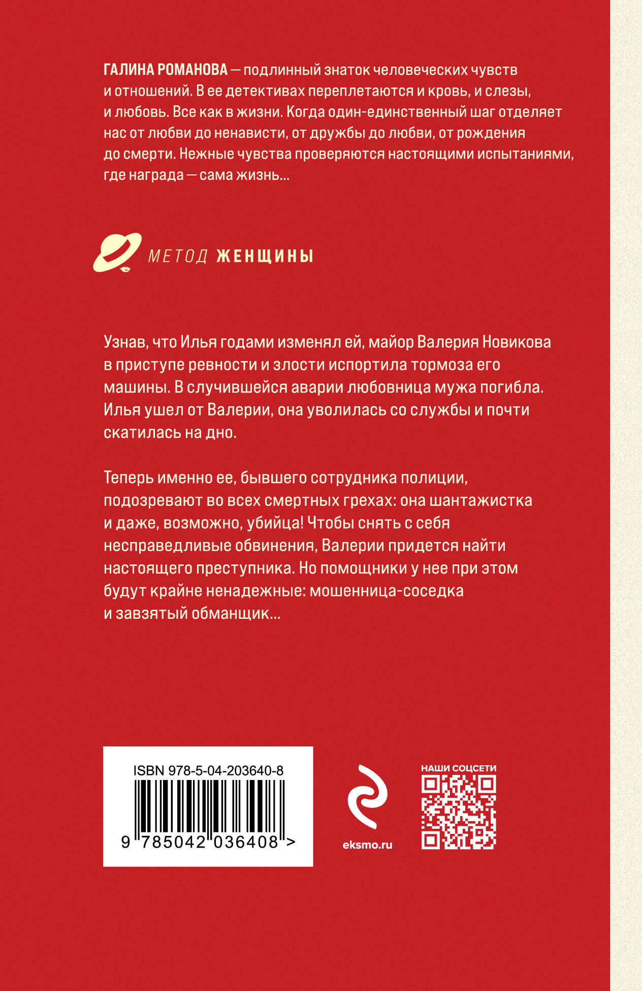 Узнав, что Илья годами изменял ей, майор Валерия Новикова в приступе ревности и злости испортила тормоза у его машины. В случившейся аварии любовница мужа погибла. Илья ушел от Валерии, она уволилась со службы и почти скатилась на дно. Теперь именно ее, бывшего сотрудника полиции, подозревают во всех смертных грехах: она шантажистка и даже, возможно, убийца! Чтобы снять с себя несправедливые обвинения, Валерии придется найти настоящего преступника. Но помощники у нее при этом будут крайне ненадежные: мошенница-соседка и завзятый обманщик… Новая книга Галины Романовой - очень интригующая и трогательная история о том, насколько мы ответственны за то, что делаем со своей собственной жизнью. Несколько увлекательных сюжетных линий, повествующих о судьбах разных людей, развиваются параллельно, чтобы в финале сплестись в тугой узел, когда все тайны будут раскрыты, а злодеи выведены на чистую воду.| Издательство | ООО "Издательство "Эксмо" |