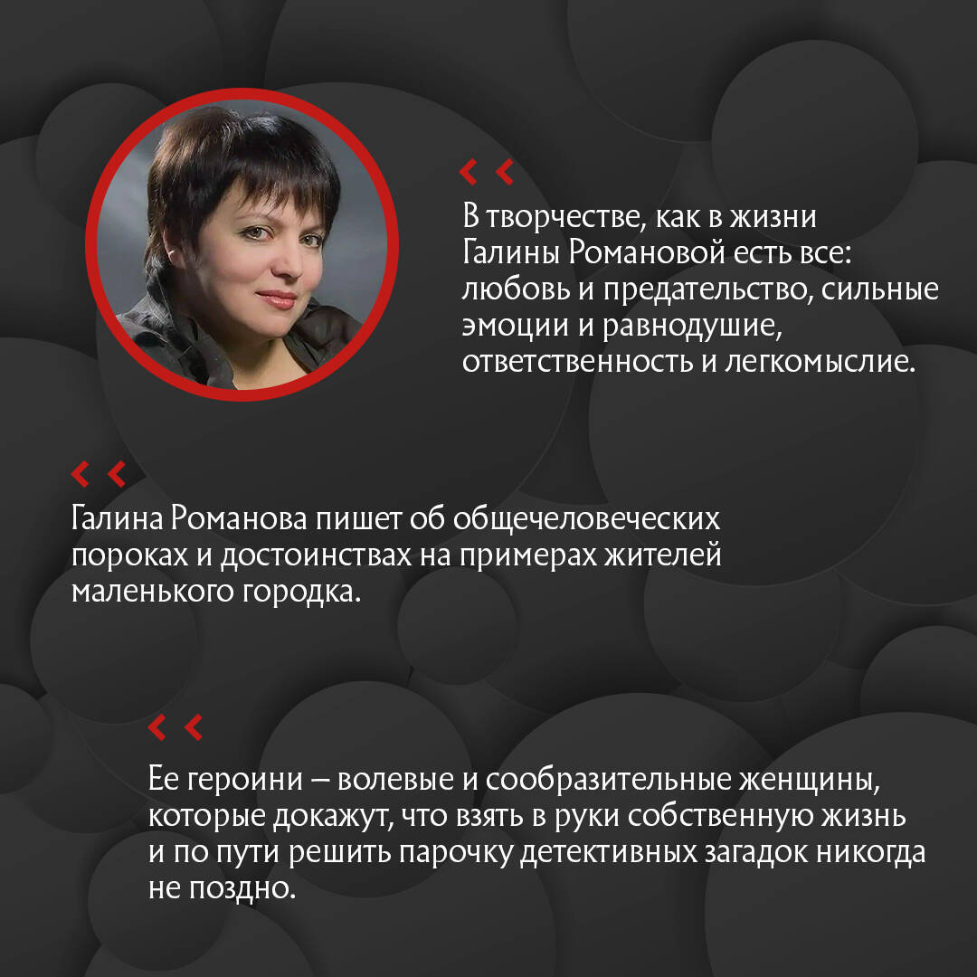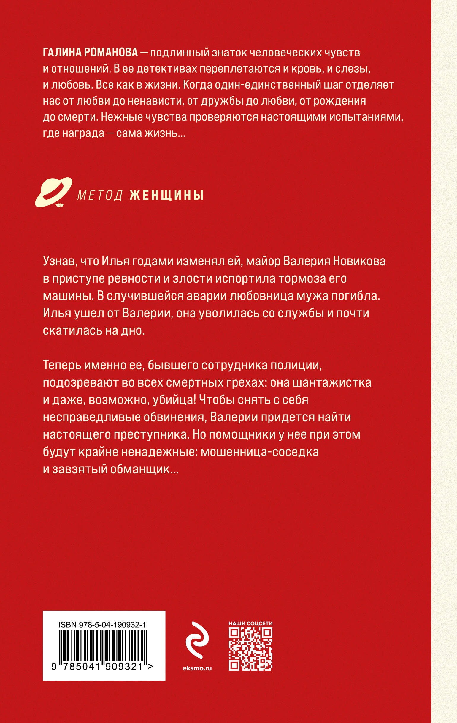 Узнав, что Илья годами изменял ей, майор Валерия Новикова в приступе ревности и злости испортила тормоза его машины. В случившейся аварии любовница мужа погибла. Илья ушел от Валерии, она уволилась со службы и почти скатилась на дно. Теперь именно ее, бывшего сотрудника полиции, подозревают во всех смертных грехах: она шантажистка и даже, возможно, убийца! Чтобы снять с себя несправедливые обвинения, Валерии придется найти настоящего преступника. Но помощники у нее при этом будут крайне ненадежные: мошенница-соседка и завзятый обманщик… Новая книга Галины Романовой - очень интригующая и трогательная история о том, насколько мы ответственны за то, что делаем со своей собственной жизнью. Несколько увлекательных сюжетных линий, повествующих о судьбах разных людей, развиваются параллельно, чтобы в финале сплестись в тугой узел, когда все тайны будут раскрыты, а злодеи выведены на чистую воду.| Издательство | ООО "Издательство "Эксмо" |