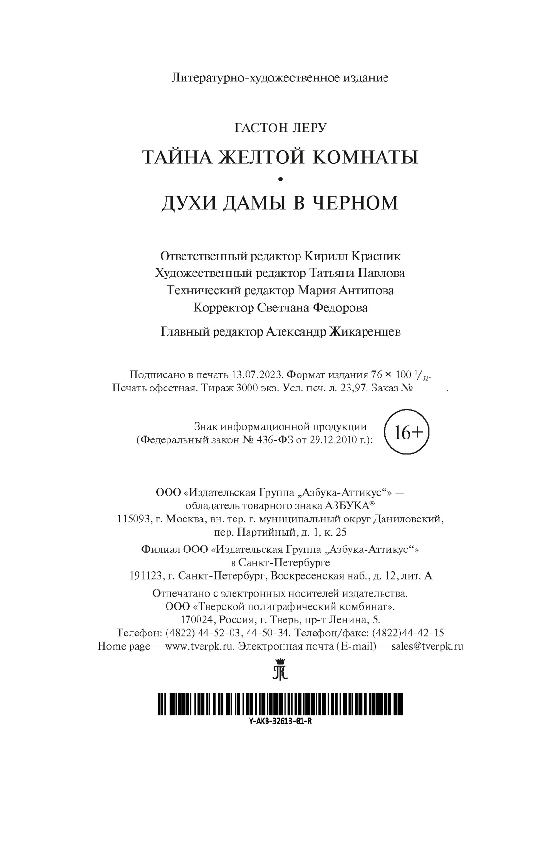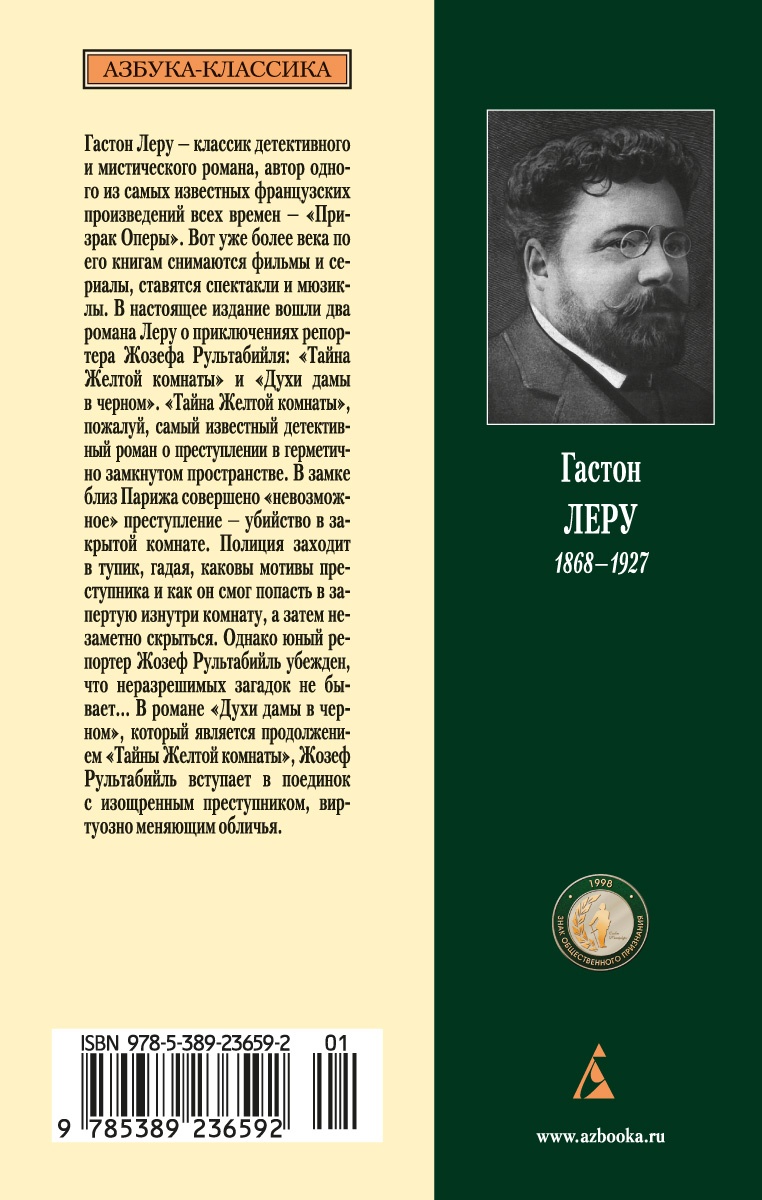 Гастон Леру - классик детективного и мистического романа, автор одного из самых известных французских произведений всех времен - «Призрак Оперы». Вот уже более века по его книгам снимаются фильмы и сериалы, ставятся спектакли и мюзиклы. В настоящее издание вошли два романа Леру о приключениях репортера Жозефа Рультабийля: «Тайна Желтой комнаты» и «Духи дамы в черном». «Тайна Желтой комнаты», пожалуй, самый известный детективный роман о преступлении в герметично замкнутом пространстве. В замке близ Парижа совершено «невозможное» преступление - убийство в закрытой комнате. Полиция заходит в тупик, гадая, каковы мотивы преступника и как он смог попасть в запертую изнутри комнату, а затем незаметно скрыться. Однако юный репортер Жозеф Рультабийль убежден, что неразрешимых загадок не бывает… В романе «Духи дамы в черном», который является продолжением «Тайны Желтой комнаты», Жозеф Рультабийль вступает в поединок с изощренным преступником, виртуозно меняющим обличья.| Издательство | Азбука |