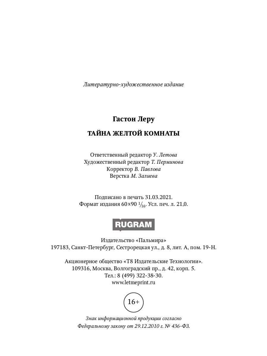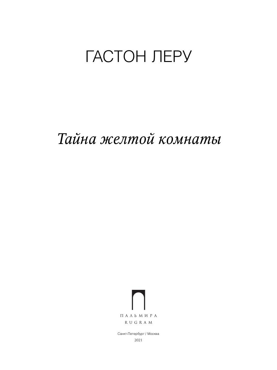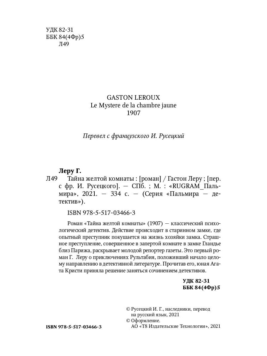 Роман «Тайна желтой комнаты» (1907) - классический психологический детектив. Действие происходит в старинном замке, где опытный преступник покушается на жизнь хозяйки замка. Страшное преступление, совершенное в запертой комнате в замке Гландье близ Парижа, раскрывает молодой репортер газеты. Это первый роман Г. Леру о приключениях Рультабия, положивший начало целому направлению в детективной литературе. Прочитав его, юная Агата Кристи приняла решение заняться сочинением детективов.| Издательство | Т8 RUGRAM |