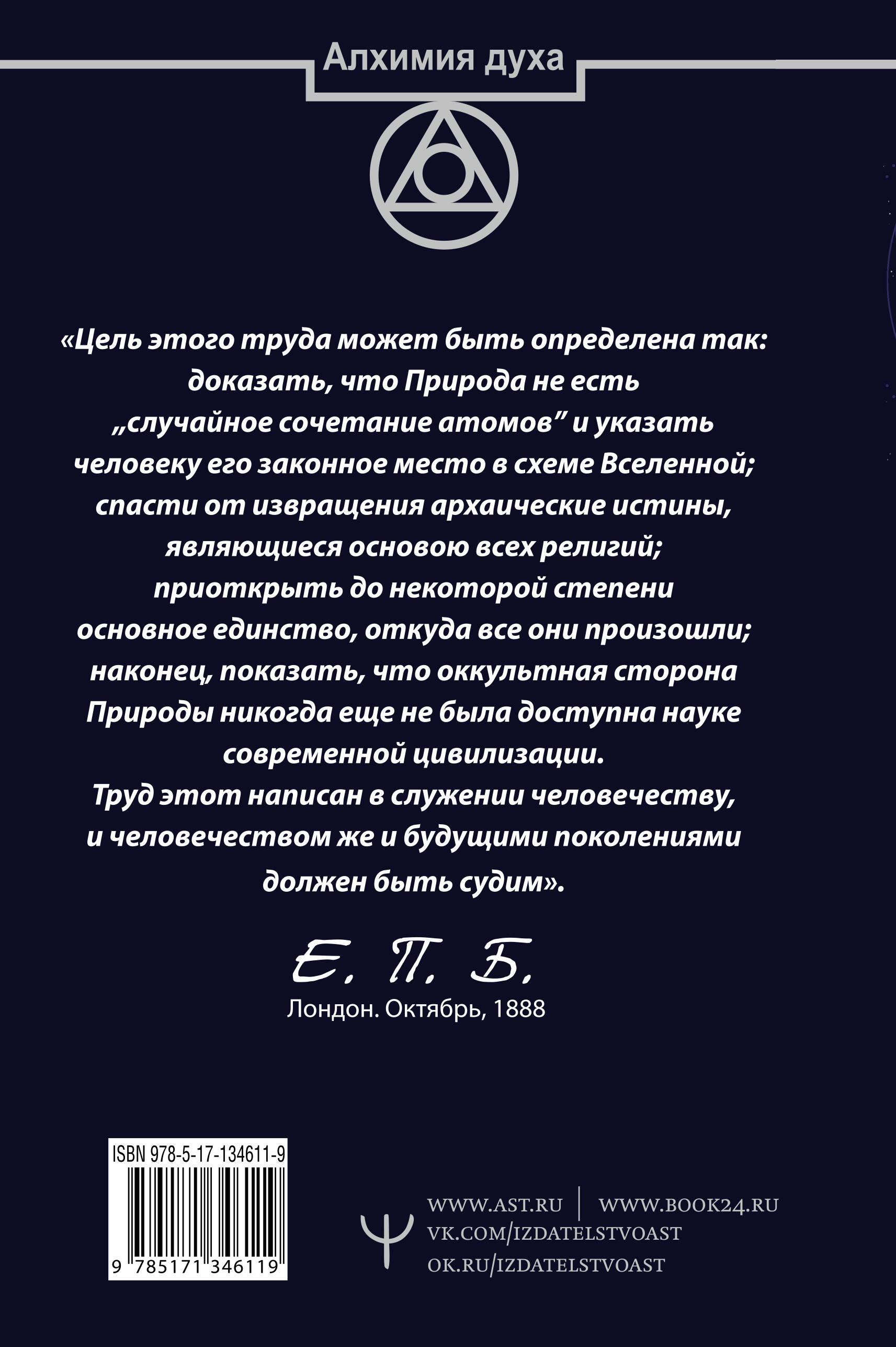 Самая объемная и самая загадочная работа Елены Блаватской открывает читателю путь к постижению величайших тайн мироздания: происхождения и эволюции Вселенной и человечества, истинной сути всех мировых религий и их единства, ощущению биения пульса Единой Жизни - вечной, невидимой и вездесущей. Основные положения Тайной Доктрины - основы всех религиозных и философских течений, когда-либо известных человечеству, проводником которой стала Елена Блаватская, ведут каждого из нас к очищению души и возвращению к Изначальному Единству - Братству человечества.| Издательство | ИЗДАТЕЛЬСТВО "АСТ" |