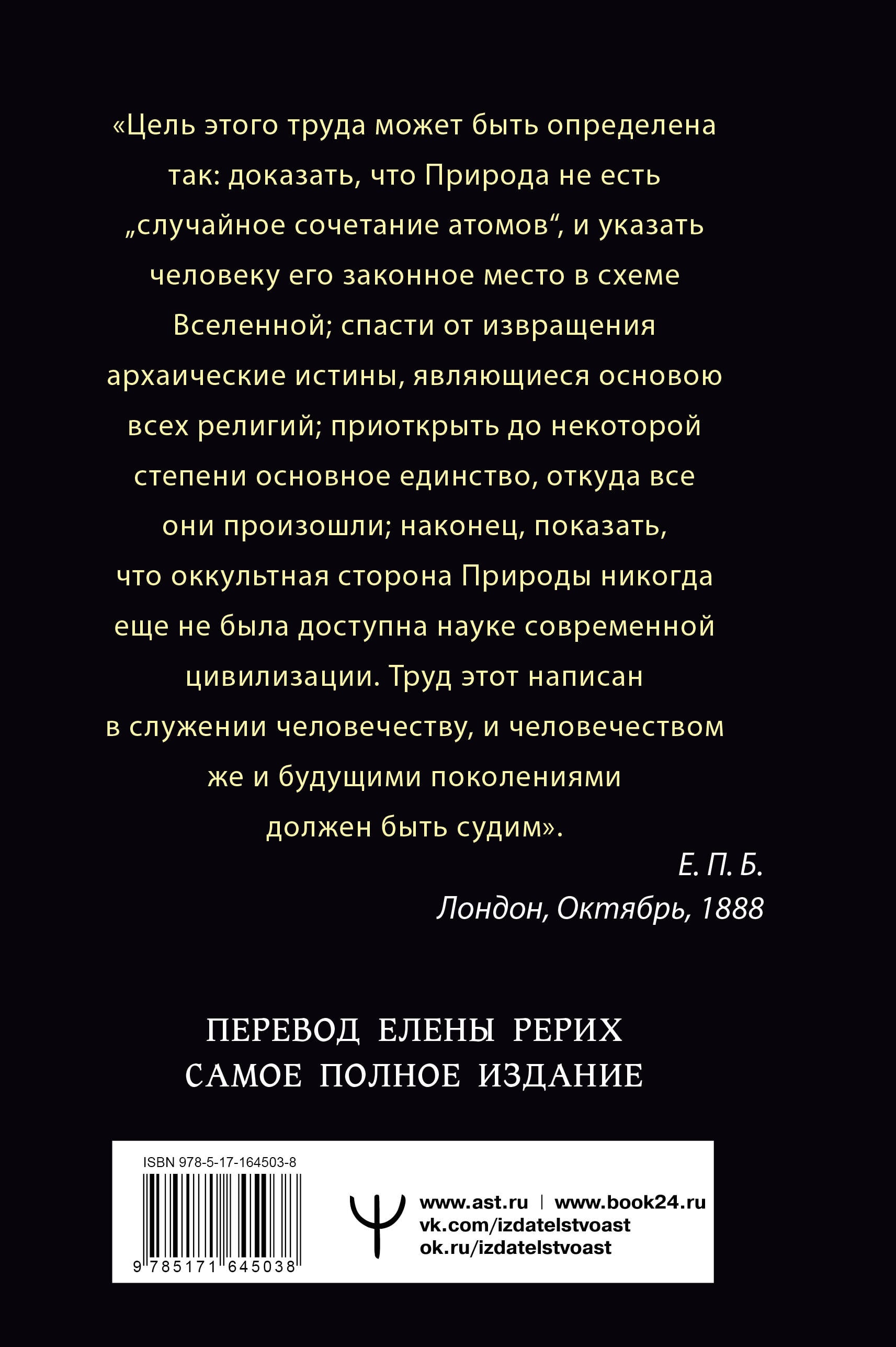 Тайная Доктрина - уникальное эзотерическое учение в переводе знаменитой Елены Рерих! Это полное издание самого важного труда Блаватской откроет вам путь к постижению величайших тайн мироздания: происхождение и эволюция Вселенной и человечества, истинная суть всех мировых религий и их единство, ощущение биения пульса Единой Жизни - вечной, невидимой и вездесущей. Основные положения Тайной Доктрины - общего фундамента всех религиозных и философских течений, когда-либо известных человечеству, - проводником которой стала Елена Блаватская, ведут каждого из нас к очищению души и возвращению к Изначальному Единству - Братству человечества. Эта книга будет интересна: 1. Тем, кто интересуется учением Рерихов и Блаватской. 2. Тем, кто ищет ответы на вечные вопросы, находится в поиске смысла жизни. 3. Тем, кто интересуется мифологией, философией, эзотерикой, оккультизмом, буддизмом, вопросами кармы, реинкарнации, необычными явлениями, духовным миром. 4. Тем, кто хочет совершенствовать свой дух, но не знает, в какую сторону ему двигаться. 5. Тем, кто интересуется различными взглядами на природу вещей, происхождение мира, место человека во Вселенной, историей религий и будущим человечества. Книга в твердой обложке. Перевод знаменитой Елены Рерих.| Издательство | Издательство "АСТ" |
