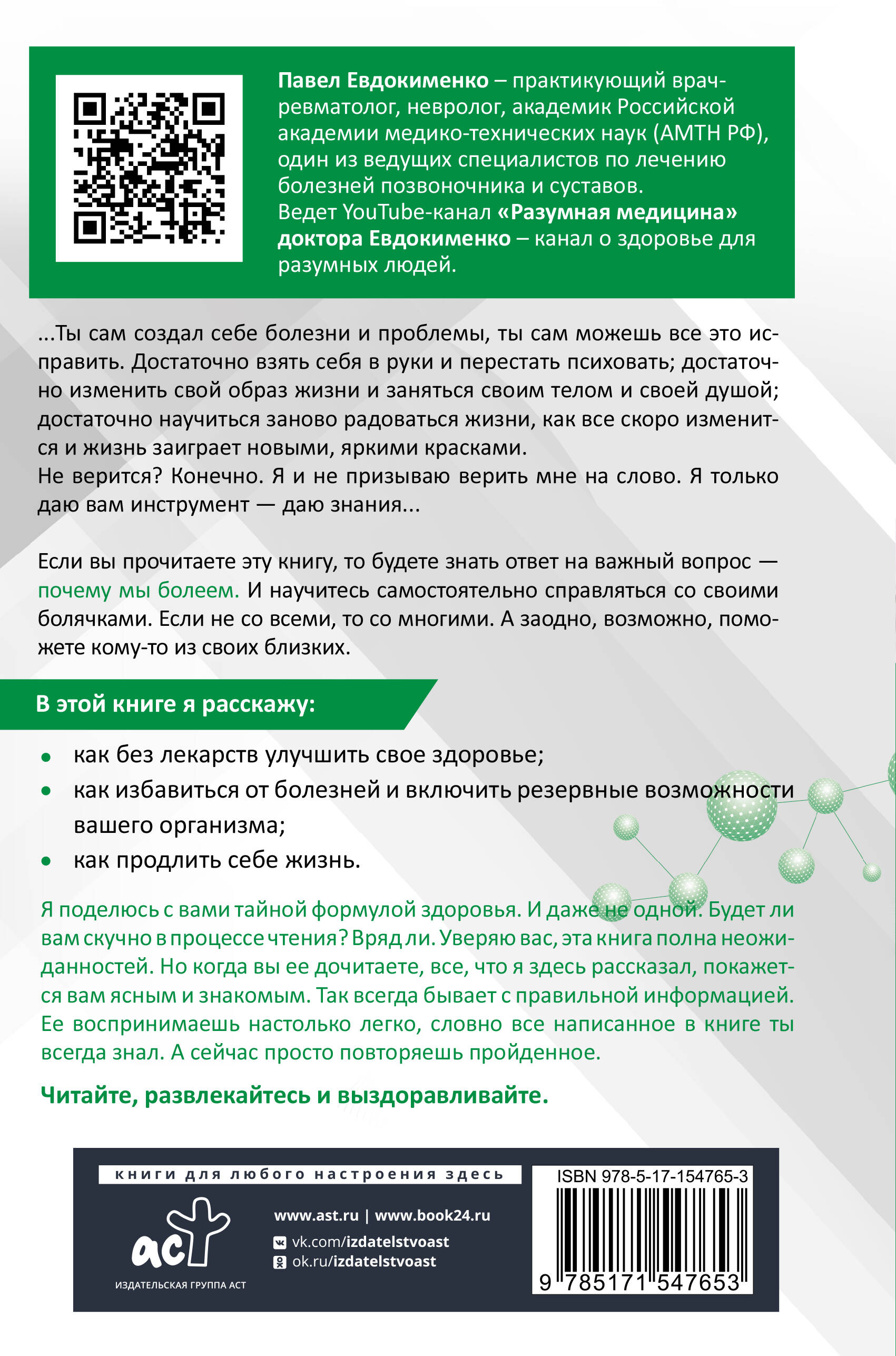 Дорогой друг! Если вы прочитаете эту книгу, то будете знать ответ на важный вопрос - почему мы болеем. И научитесь самостоятельно справляться со своими болячками. Если не со всеми, то со многими. А заодно, возможно, поможете кому-то из своих близких. Будет ли вам скучно в процессе чтения? Вряд ли. Уверяю вас, эта книга полна неожиданностей. Но когда вы ее дочитаете, все, что я здесь рассказал, покажется вам ясным и знакомым. Так всегда бывает с правильной информацией. Ее воспринимаешь настолько легко, словно все написанное в книге ты всегда знал. А сейчас просто повторяешь пройденное. Читайте, развлекайтесь и выздоравливайте.| Издательство | ИЗДАТЕЛЬСТВО "АСТ" |