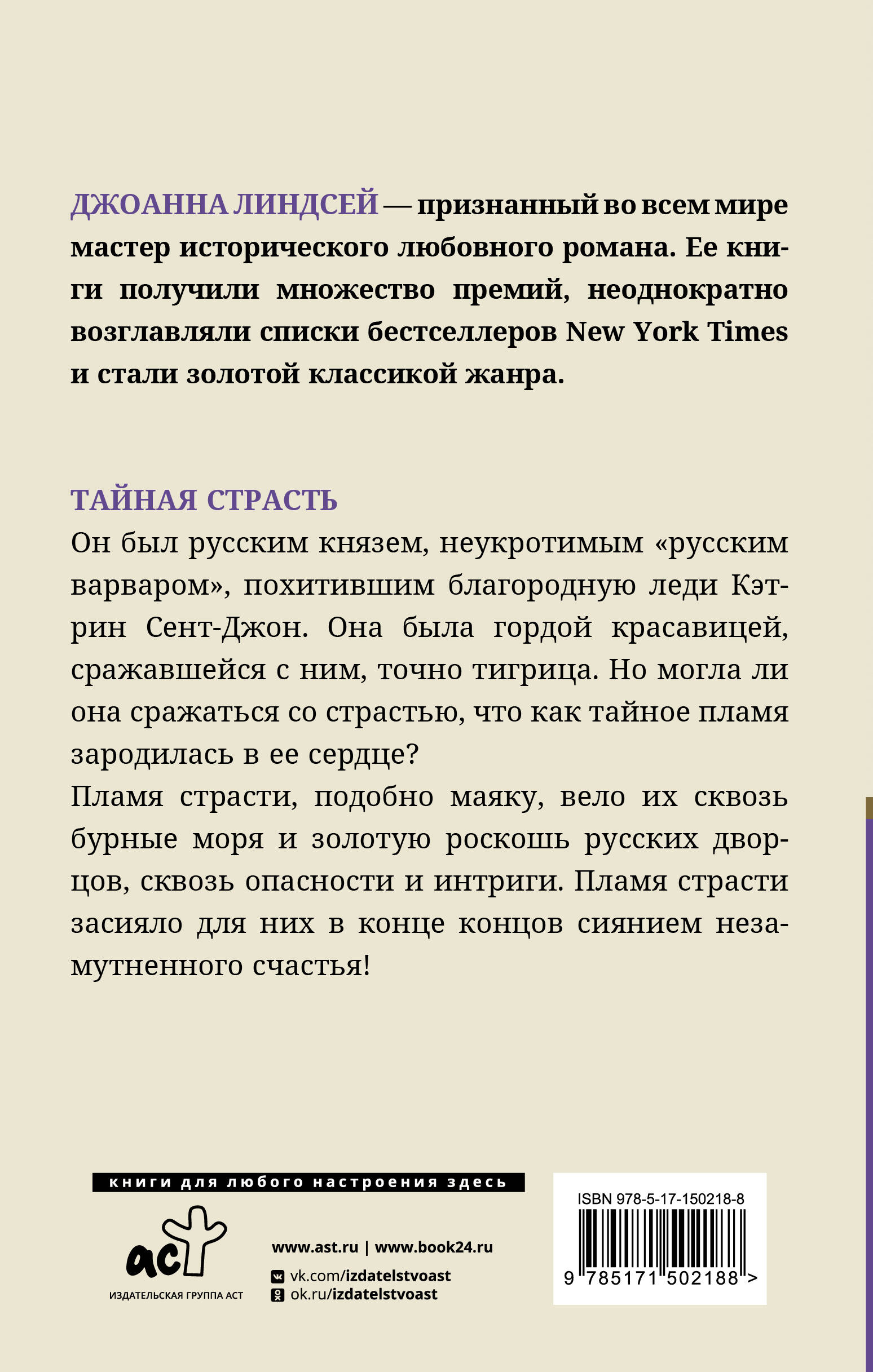 Он был русским князем, неукротимым "русским варваром", похитившим благородную леди Кэтрин Сент-Джон. Она была гордой красавицей, сражавшейся с ним, точно тигрица. Но могла ли она сражаться со страстью, что как тайное пламя зародилась в ее сердце? Пламя страсти, подобно маяку, вело их сквозь бурные моря и золотую роскошь русских дворцов, сквозь опасности и интриги. Пламя страсти засияло для них в конце концов сиянием незамутненного счастья!| Издательство | ИЗДАТЕЛЬСТВО "АСТ" |