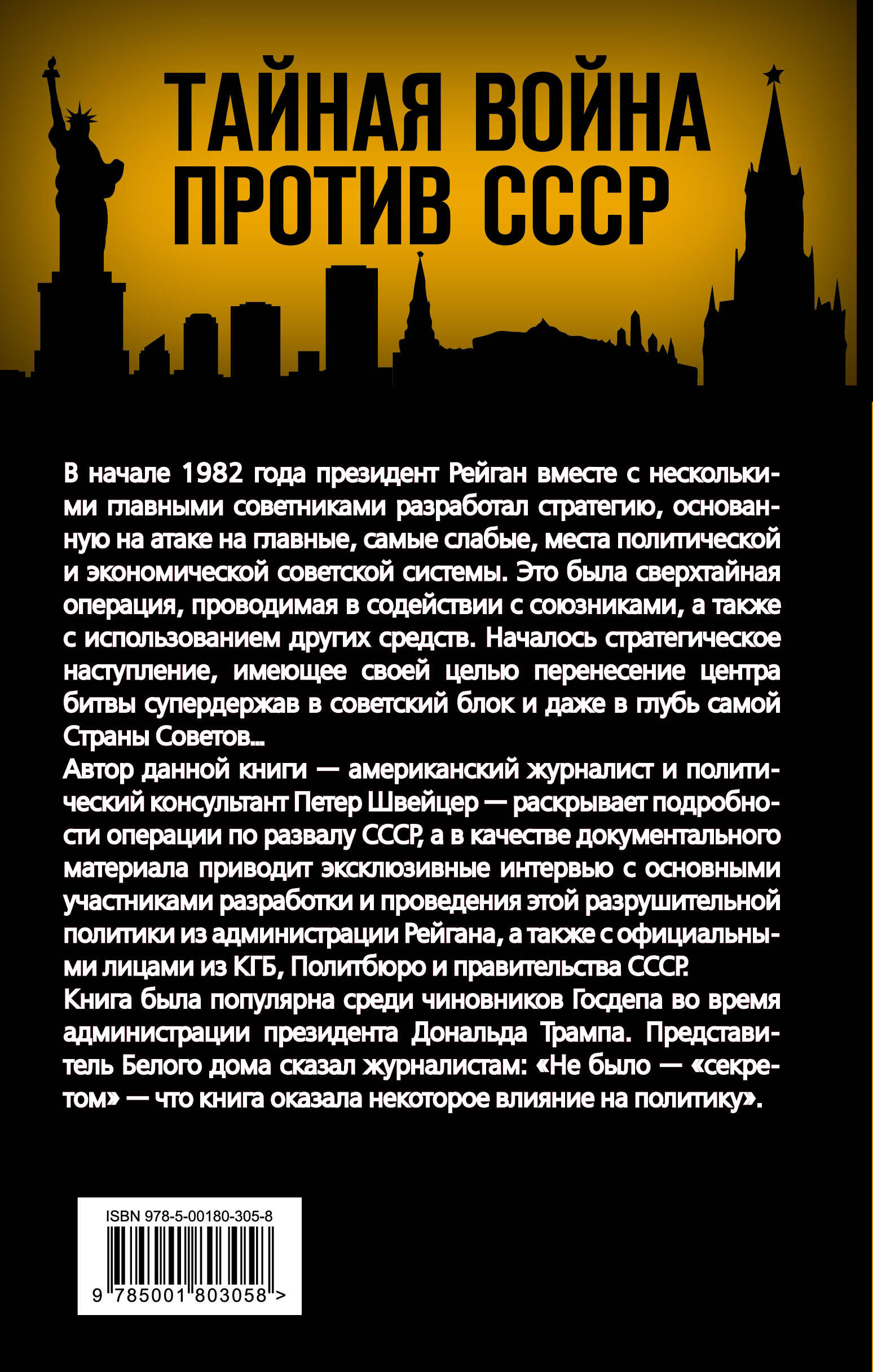 В начале 1982 года президент Рейган вместе с несколькими главными советниками разработал стратегию, основанную на атаке на главные, самые слабые места политической и экономической советской системы. Это была сверхтайная операция, проводимая в содействии с союзниками, а также с использованием других средств. Началось стратегическое наступление, имеющее своей целью перенесение центра битвы супердержав в советский блок и даже вглубь самой Страны Советов... Автор данной книги - американский журналист и политический консультант Петер Швейцер раскрывает подробности операции по развалу СССР, а в качестве документального материала приводит эксклюзивные интервью с основными участниками разработки и проведения этой разрушительной политики из администрации Рейгана, а также с официальными лицами из КГБ, Политбюро и правительства СССР. Книга была популярна среди чиновников Госдепа во время администрации президента Дональда Трампа. Представитель Белого дома сказал журналистам: "Не было "секретом", что книга оказала некоторое влияние на политику".