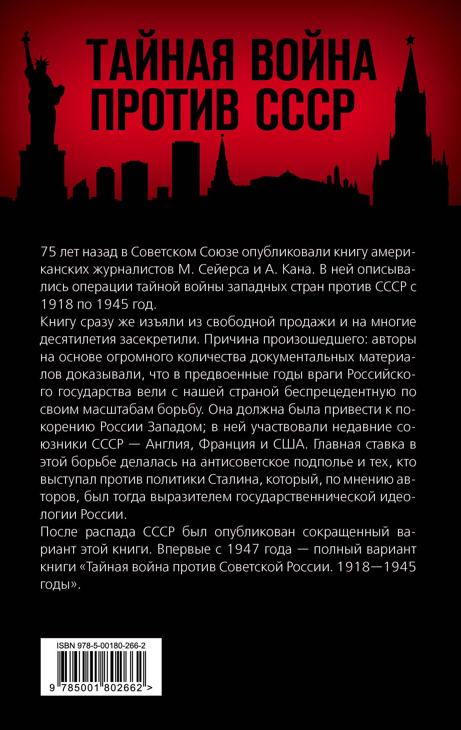 75 лет назад в Советском Союзе опубликовали книгу американских журналистов М. Сейерса и А. Кана. В ней описывались операций тайной войны западных стран против СССР с 1918 года по 1945 год. Книгу сразу же изъяли из свободной продажи и на многие десятилетия засекретили. Причина произошедшего: авторы на основе огромного количества документальных материалов доказывали, что в предвоенные годы враги российского государства вели с нашей страной беспрецедентную по своим масштабам борьбу. Она должна была привести к покорению России Западом; в ней участвовали недавние союзники СССР - Англия, Франция и США. Главная ставка в этой борьбе делалась на антисоветское подполье и тех, кто выступал против политики Сталина, который, по мнению авторов, был тогда выразителем государственнической идеологии России. После распада СССР был опубликован сокращенный вариант этой книги. Впервые, с 1947 года - полный вариант книги «Тайной войны против Советской России».| Издательство | Родина Издательство ООО |