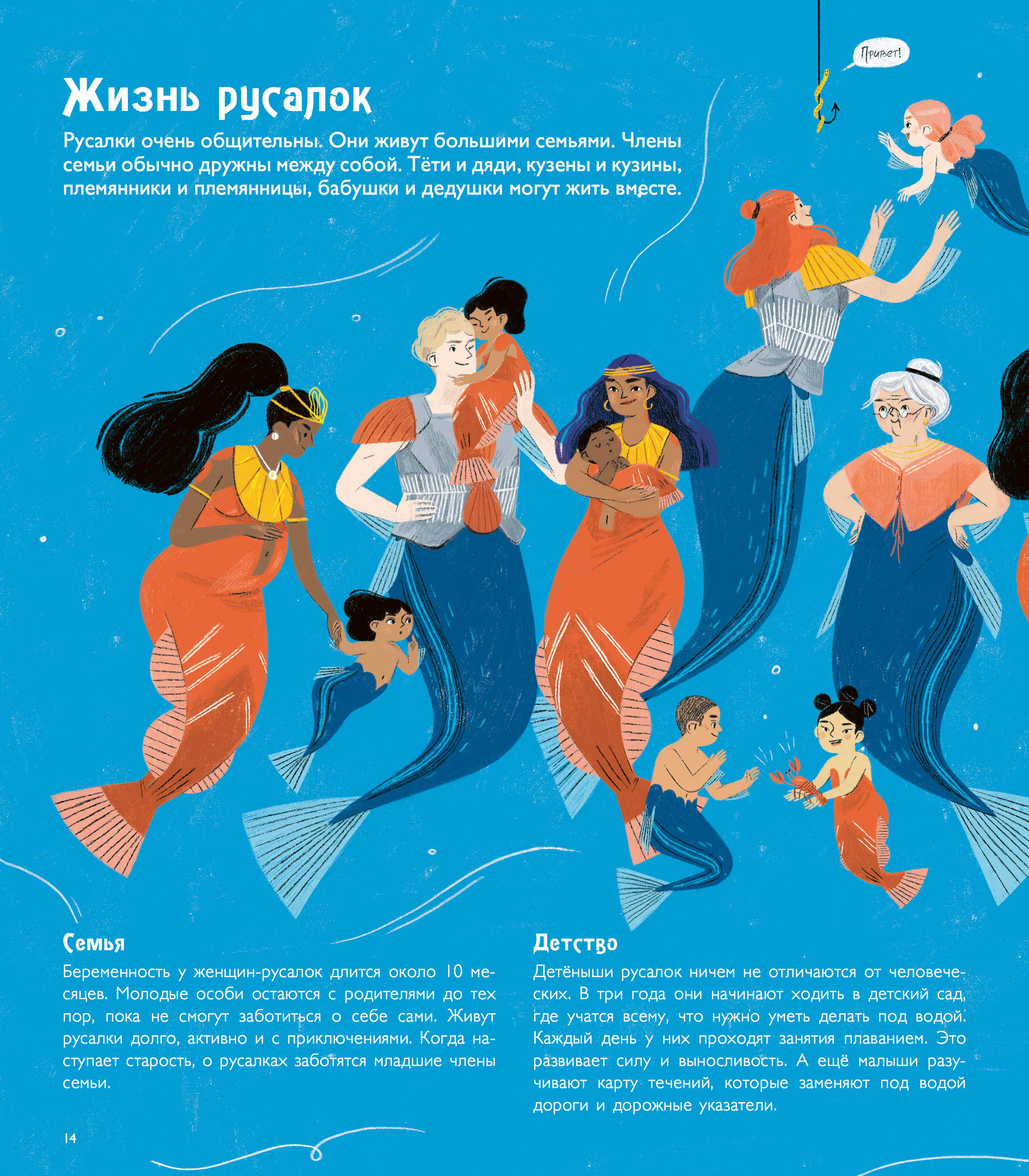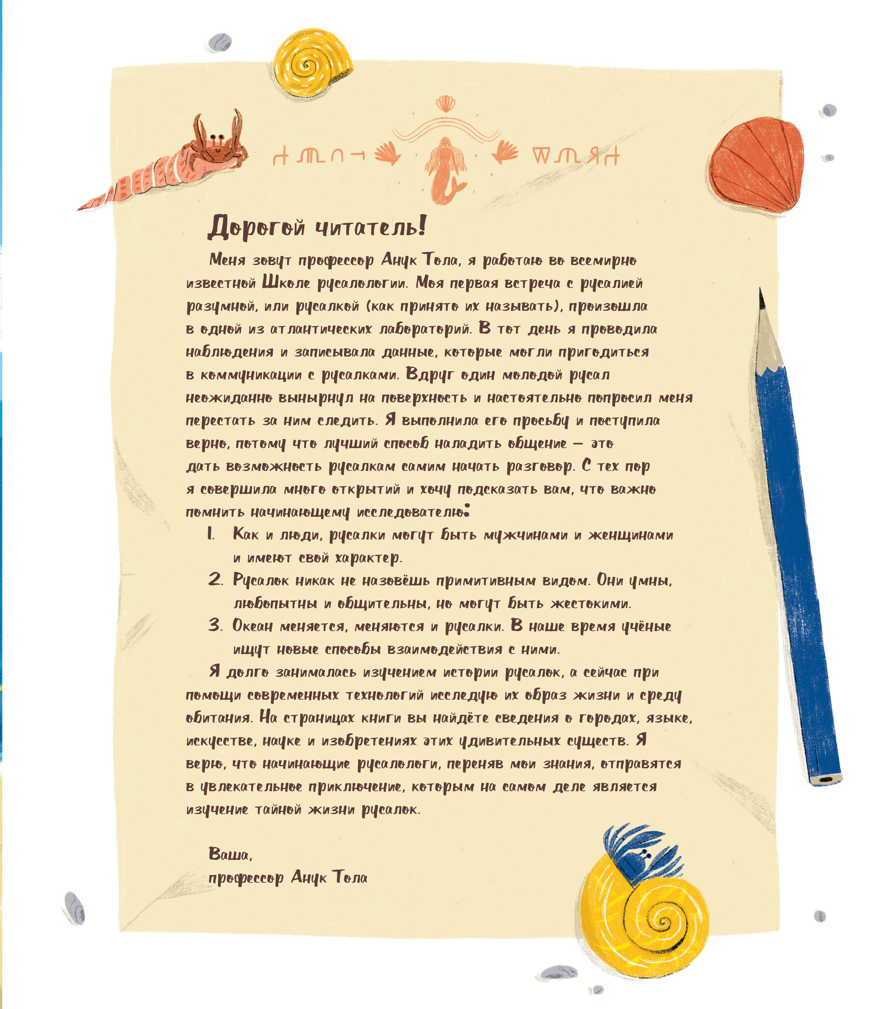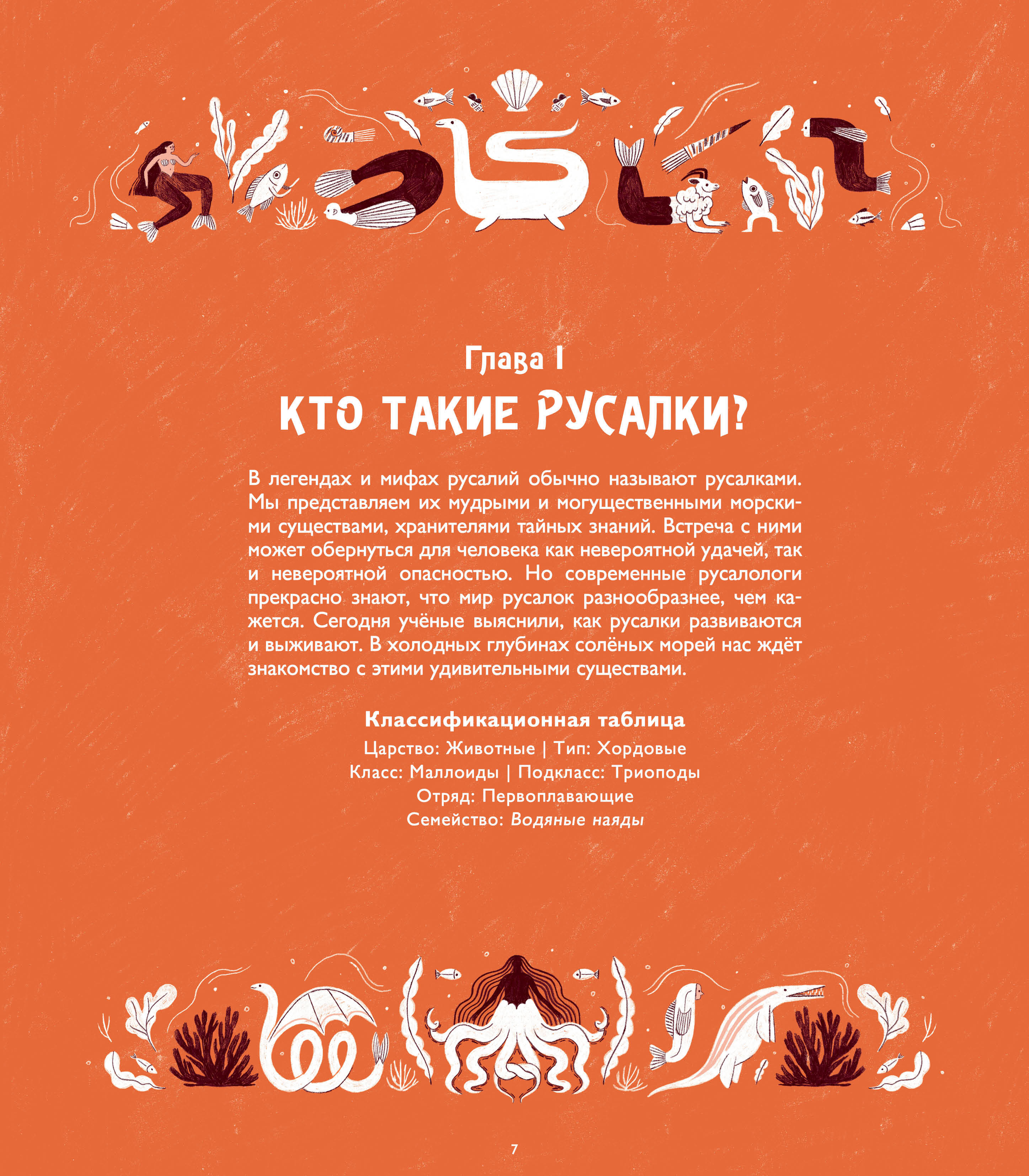 Вместе с ученым из Школы русалологии отправляемся в подводный мир. Узнаем, как отличать русалок по узору на хвосте, как строить подводные города в водорослях, зачем нужны буль-буль-камеры и карты течений. Не останется без внимания и алфавит русалок. Воспользуйтесь им, чтобы почувствовать себя ученым-первооткрывателем и прочитать спрятанные на страницах послания. Книга подойдет детям, которые увлекаются легендами и историями о волшебных существах.