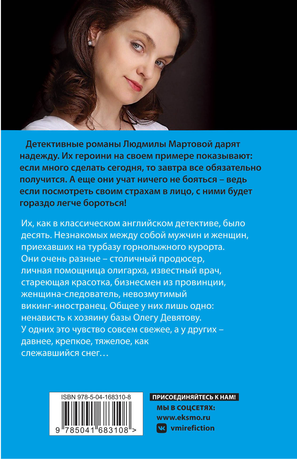 Их, как в классическом английском детективе, было десять. Незнакомых между собой мужчин и женщин, приехавших на турбазу горнолыжного курорта. Они очень разные - столичный продюсер, личная помощница олигарха, известный врач, стареющая красотка, бизнесмен из провинции, женщина-следователь, невозмутимый викинг-иностранец. Общее у них лишь одно: ненависть к хозяину базы Олегу Девятову. У одних это чувство совсем свежее, а у других - давнее, крепкое, тяжелое, как слежавшийся снег… Людмила Мартова - мастер увлекательной детективной мелодрамы, автор захватывающих остросюжетных историй. Их отличают закрученная детективная интрига, лихой финал с неожиданной развязкой и, конечно же, яркая любовная линия. Героини романов Людмилы Мартовой - современные молодые женщины, которые точно знают, чего хотят от жизни.| Издательство | Эксмо |