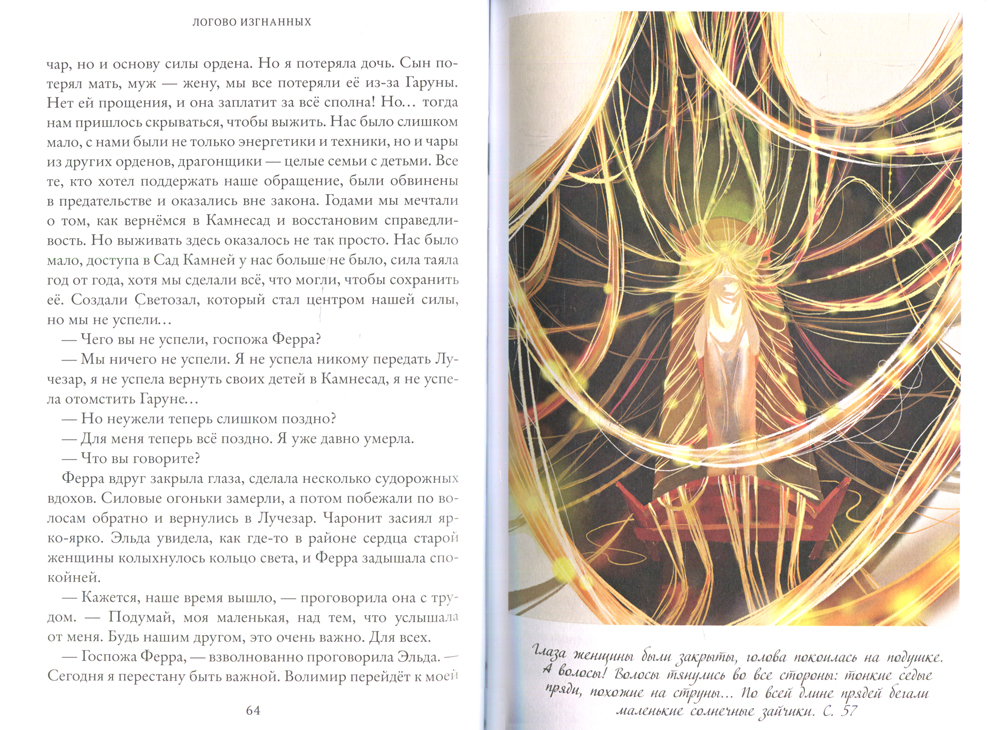 В судьбе Эльды неожиданный поворот - вместе с Шани она оказывается в Логове изгнанных, убежище, которое в течение долгого времени было скрыто от посторонних глаз. Долгожданная встреча с родителями приносит не только радость, но и новое испытание. Девочке предстоит сделать трудный выбор: расстаться с чаронитом или пойти против воли родителей, принять судьбу или попытаться её изменить. Друзья, оставшиеся наверху, прикладывают все силы, чтобы отыскать девочек, но действовать им приходится тайно, ведь взрослые слишком заняты, чтобы им помогать. А тот единственный, кто может незаметно проникнуть в Логово, находится в смертельной опасности. Настоящего врага распознать непросто, хоть он и обретает всё более реальные черты. Полёты на шнырках, знакомство с водяными драконами, прикосновение к силе света, мыслесферы и зрительные иллюзии, дружба и предательство, жестокость и самопожертвование, боль потерь и радость встреч, погони и приключения - всё это ждёт читателя в третьей книге цикла «Тайны Чароводья».| Издательство | Абрикобукс |