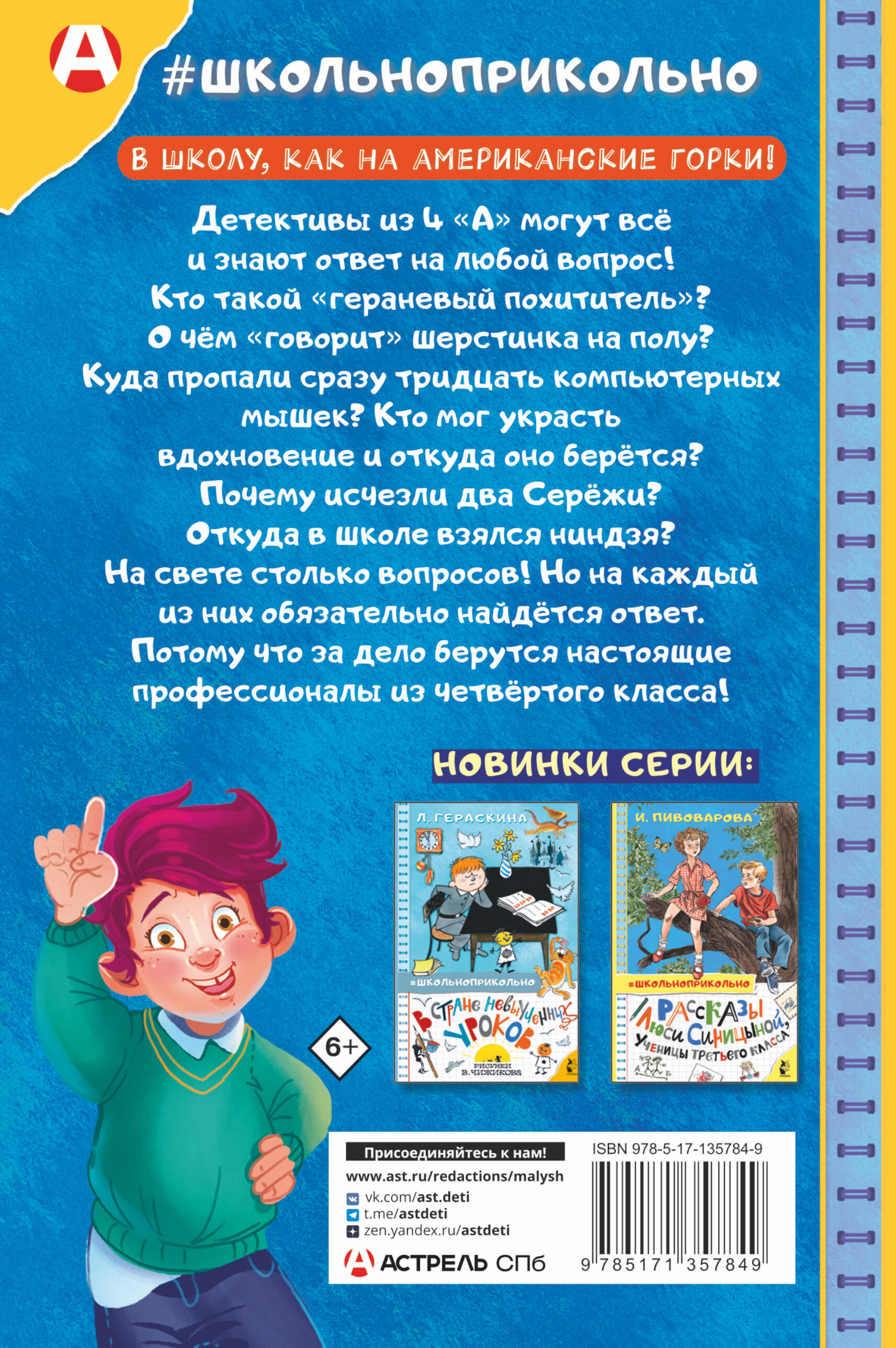 Детективы из 4 "А" могут всё и знают ответ на любой вопрос! Кто такой "гераневый похититель"? О чём "говорит" шерстинка на полу? Куда пропали сразу тридцать компьютерных мышек? Кто мог украсть вдохновение и откуда оно берётся? Почему исчезли два Серёжи? Откуда в школе взялся ниндзя? На свете столько вопросов! Но на каждый из них обязательно найдётся ответ. Потому что за дело берутся настоящие профессионалы из четвёртого класса…