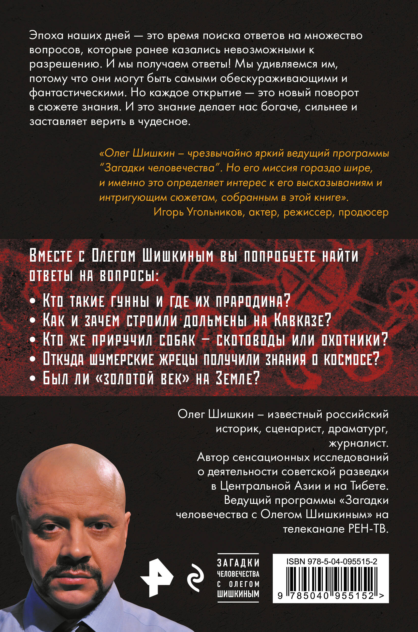 «Тайны древних цивилизаций» - первая книга из серии «Загадки человечества с Олегом Шишкиным». Олег Шишкин - известный российский историк, сценарист, драматург, журналист. Автор сенсационных исследований о деятельности советской разведки в Центральной Азии и Тибете. Ведущий популярной программы «Загадки человечества с Олегом Шишкиным» на телеканале РЕН-ТВ. Мы живем в интереснейшее время - время поиска ответов на множество вопросов, которые ранее казались невозможными к разрешению. И мы получаем ответы! Мы удивляемся им, ведь они могут быть самыми неожиданными, обескураживающими и фантастическими. Каждое открытие - это новый поворот в сюжете знания. И это знание делает нас богаче, сильнее и заставляет верить в чудесное. Вместе с Олегом Шишкиным вы попробуете заглянуть в далекое прошлое человечества и найти ответы на вопросы: - Кто такие гунны и где их прародина? - Как и зачем строили дольмены на Кавказе? - Кто же приручил собак - скотоводы или охотники? - Откуда шумерские жрецы получили знания о Космосе? - Был ли «золотой век» на земле? «Олег Шишкин - чрезвычайно яркий ведущий программы «Загадки человечества». Но его миссия гораздо шире, и именно это определяет интерес к его высказываниям и интригующим сюжетам, собранным в этой книге». - Игорь Угольников, актер, режиссер, продюсер| Издательство | ООО "Издательство "Эксмо" |