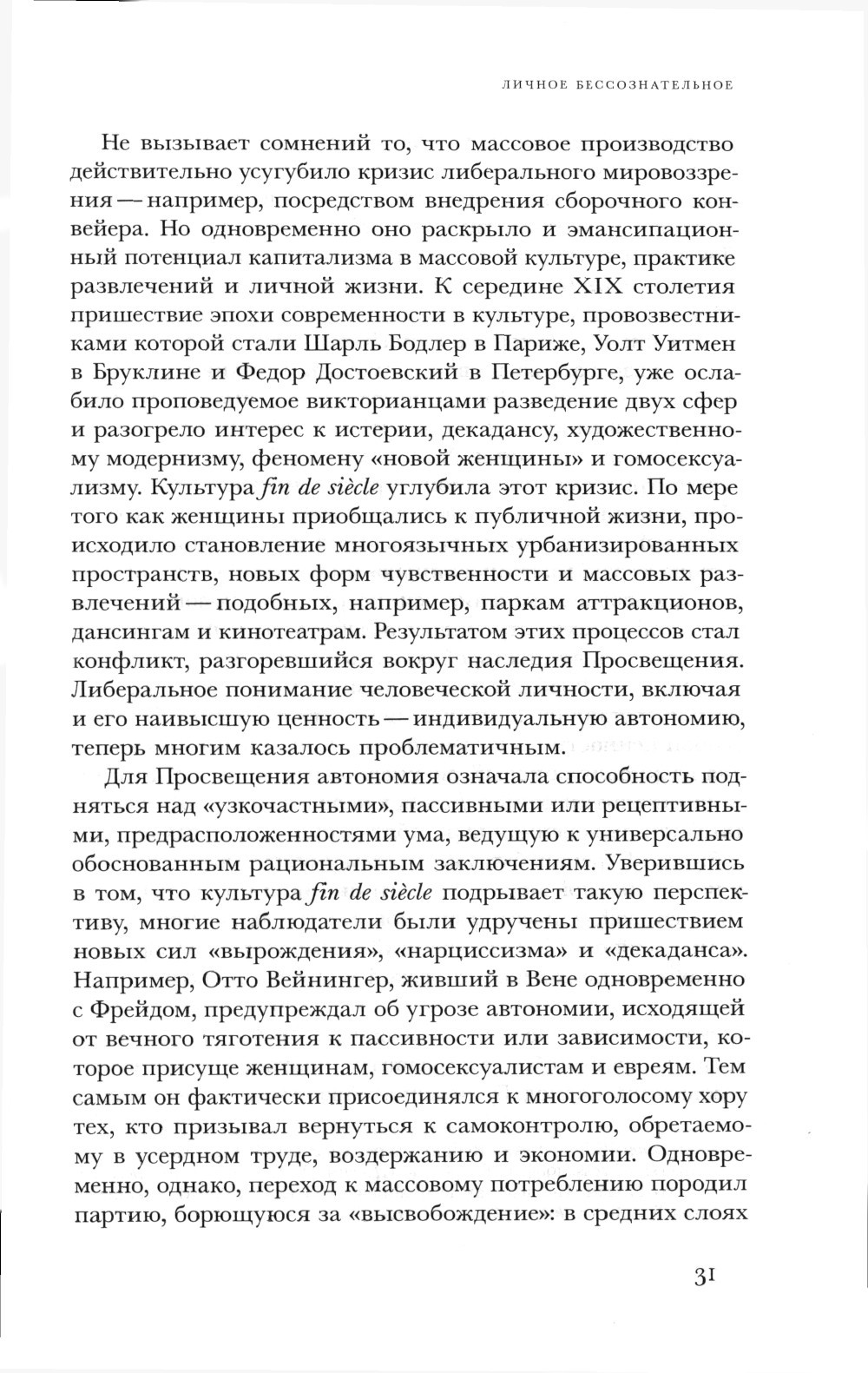 Более чем столетняя история психоанализа полна неожиданных и драматических поворотов. Получив признание в качестве вдохновляющего языка человеческой эмансипации, он сыграл центральную роль в появлении модернизма в 1920-е годы, оформлении британской и американской версий «государства всеобщего благосостояния» в 1940-1950-е, возникновении бунтарского радикализма в 1960-е, движения за гендерные права и сексуальные идентичности в 1970-е. Но одновременно психоанализ сделался оплотом ксенофобских предрассудков, блокирующих политическое участие, в какой-то момент стал вырождающейся профессией и даже превратился в «псевдонауку». Книга Эли Зарецки - это попытка исследовать парадоксы социальной и культурной истории психоанализа. Автор стремится раскрыть и вновь утвердить освобождающее измерение психоаналитической мысли, не отрицая при этом обоснованности критического взгляда на нее и потребности переосмыслить ее наследие.
