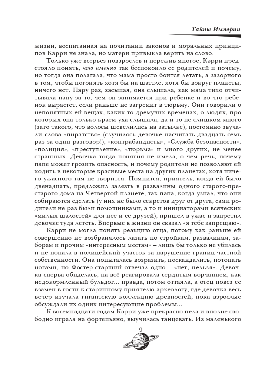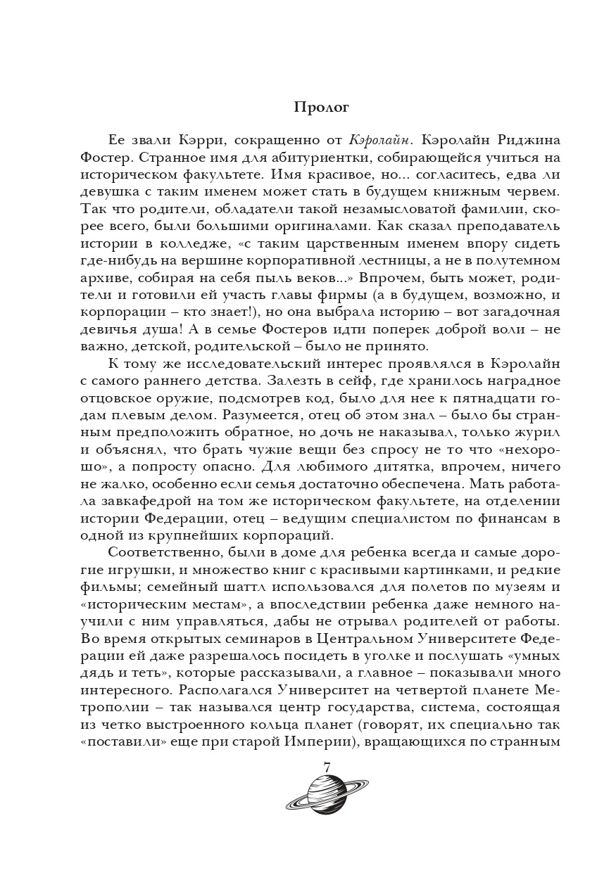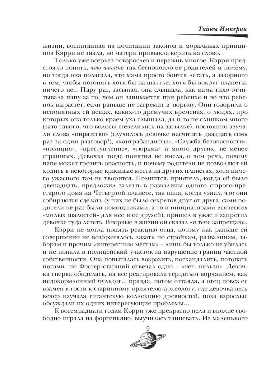 Юная Кэролайн мечтает стать космическим исследователем и раскрыть тайны исчезнувших цивилизаций. Но ее жизнь неожиданно и резко меняется во время первой же экспедиции. Девушка узнаёт, что воспитывалась в приемной семье, а ее настоящие родители служили давно исчезнувшему, проклятому государству - Империи. Едва вырвавшись из лап спецслужб и врагов семьи, девушка примыкает к выжившим приверженцам старых законов и становится мишенью для охотников за отцовским наследством. Наша героиня начинает свой полный опасных приключений путь к славе имперского командира. Верным помощником на нем становятся разумные корабли - «Тау» и «Глорх», самый ценный из отцовских подарков...| Издательство | Т8 RUGRAM |
