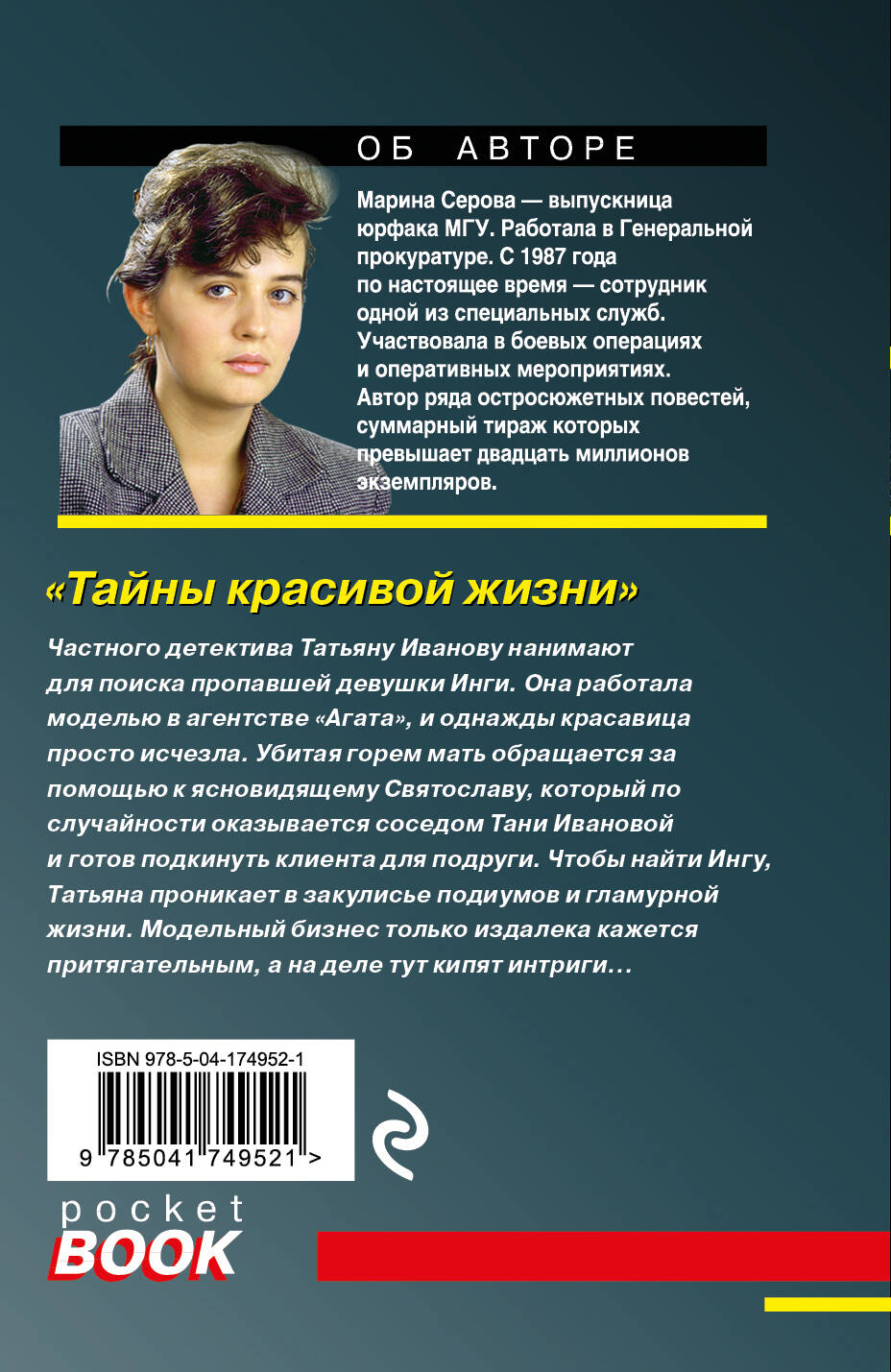 Марина Серова - феномен современного отечественного детективного жанра. Выпускница юрфака МГУ, работала в Генеральной прокуратуре. С 1987 года по настоящее время - сотрудник одной из специальных служб. Участвовала в боевых операциях и оперативных мероприятиях. Автор ряда остросюжетных повестей, суммарный тираж которых превышает двадцать миллионов экземпляров. Частного детектива Татьяну Иванову нанимают для поиска пропавшей девушки Инги. Она работала моделью в агентстве «Агата», и однажды красавица просто исчезла. Убитая горем мать обращается за помощью к ясновидящему Святославу, который по случайности оказывается соседом Тани Ивановой и готов подкинуть клиента для подруги. Чтобы найти Ингу, Татьяна проникает в закулисье подиумов и гламурной жизни. Модельный бизнес только издалека кажется притягательным, а на деле тут кипят интриги… Конечно, Татьяна Иванова легко узнает все тайны красивой жизни изнутри!| Издательство | ООО "Издательство "Эксмо" |