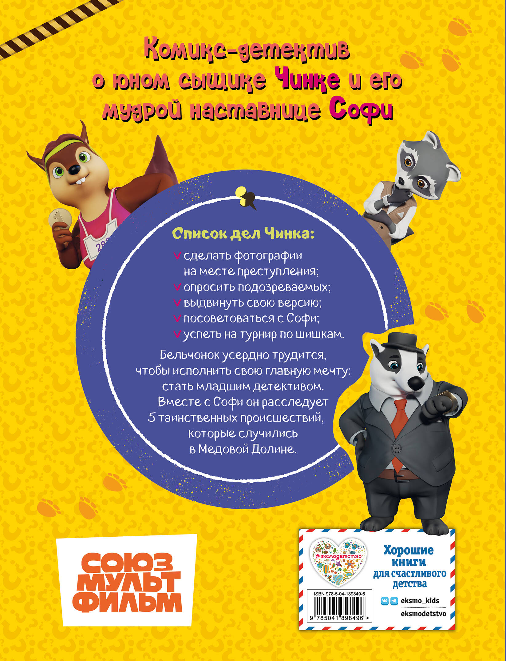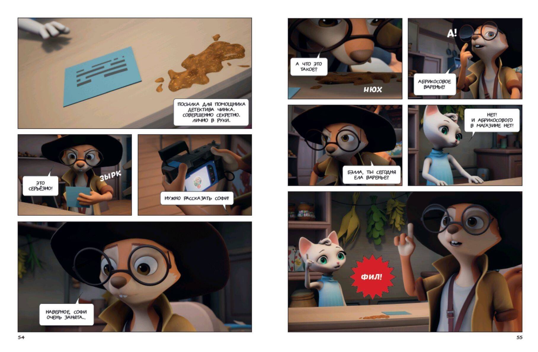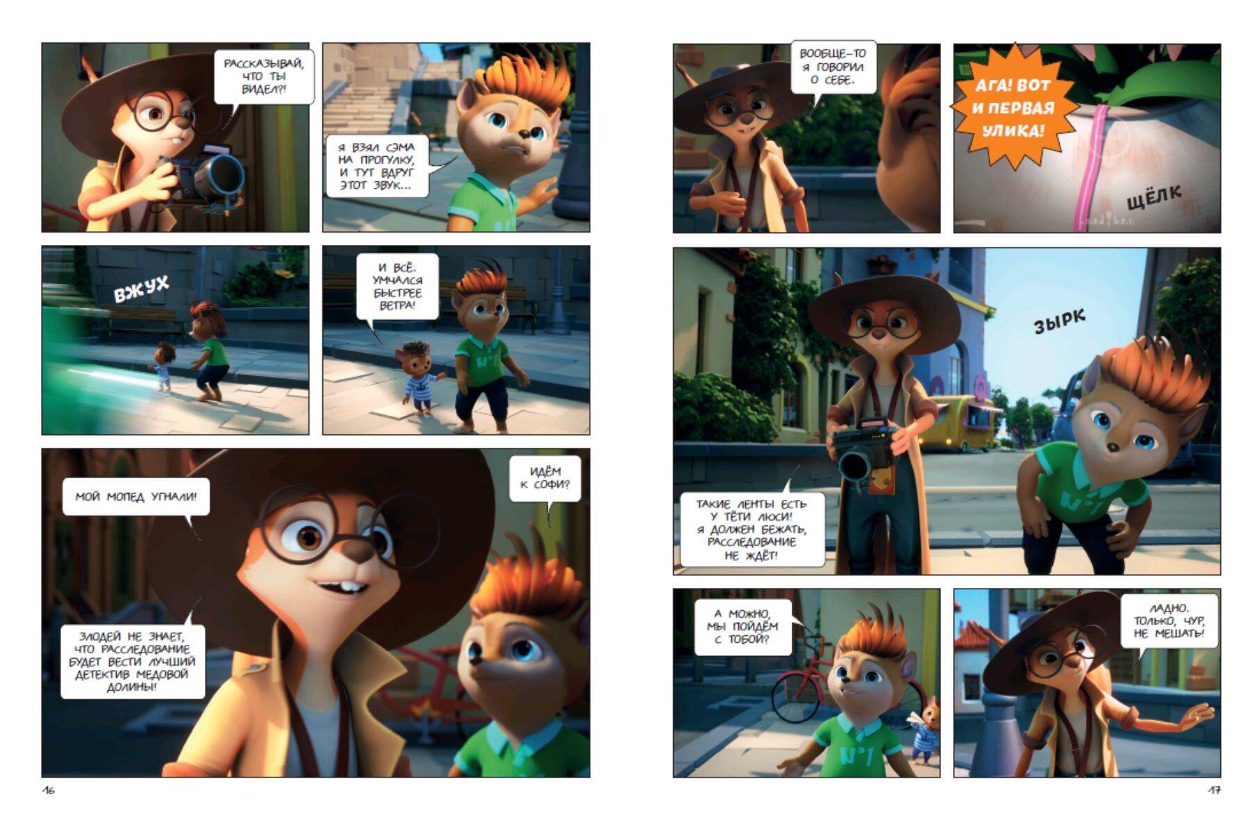 5 детективных историй в формате комикса для фанатов мультсериала «Тайны Медовой Долины» от студии «Союзмультфильм». Детектив Софи расследует любое преступление, будь то кража пуговиц, таинственная пропажа мопеда, испорченные манекены или исчезнувшая коробка. Её помощник Чинк не слишком внимателен и часто попадает в неприятности, но крайне серьёзно относится к своим обязанностям. Бельчонок мечтает о звании младшего детектива. С каждым раскрытым делом Чинк становится опытнее и самостоятельнее. Благодаря поддержке и наставлениям Софи он осваивает главные принципы расследования: поиск улик и мотива, опрос подозреваемых, организация засады и проведение следственного эксперимента. Вместе с Чинком вы пройдёте путь от несмышлёного ученика до независимого сыщика. Этот увлекательный комикс-детектив учит не сдаваться и добиваться поставленных целей.