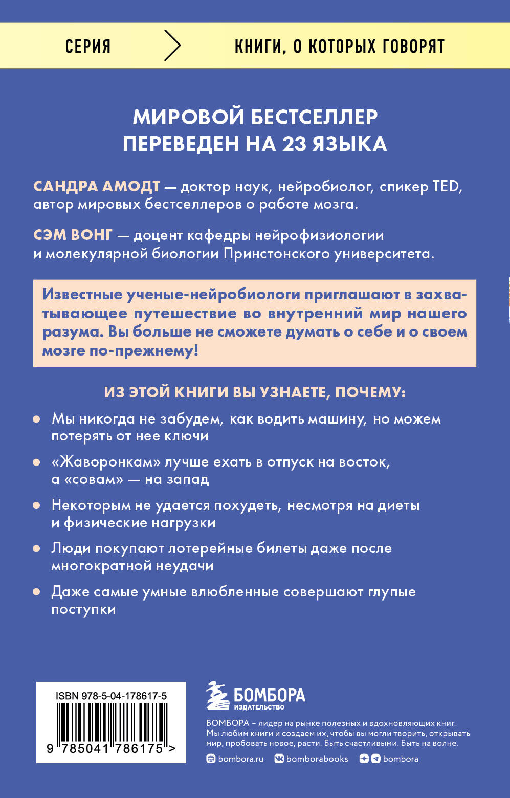 Вы больше не сможете думать о себе и о своем мозге по-прежнему! Известные нейробиологи, Сандра Амодт и Сэм Вонг, приглашают в захватывающее путешествие во внутренний мир нашего разума. В этой книге нет сложных научных объяснений, только максимум интересных фактов, полезной информации и удивительных примеров работы мозга, связанных со всеми сферами жизни: отношений, обучения, карьеры и здоровья. Из этой книги вы узнаете, почему: - Мы никогда не забудем, как водить машину, но можем потерять от нее ключи. - «Жаворонкам» лучше ехать в отпуск на восток, а «совам» - на запад. - Некоторым не удается похудеть, несмотря на диеты и физические нагрузки. - Люди покупают лотерейные билеты даже после многократной неудачи. - Даже самые умные влюбленные совершают глупые поступки.| Издательство | ООО "Издательство "Эксмо" |