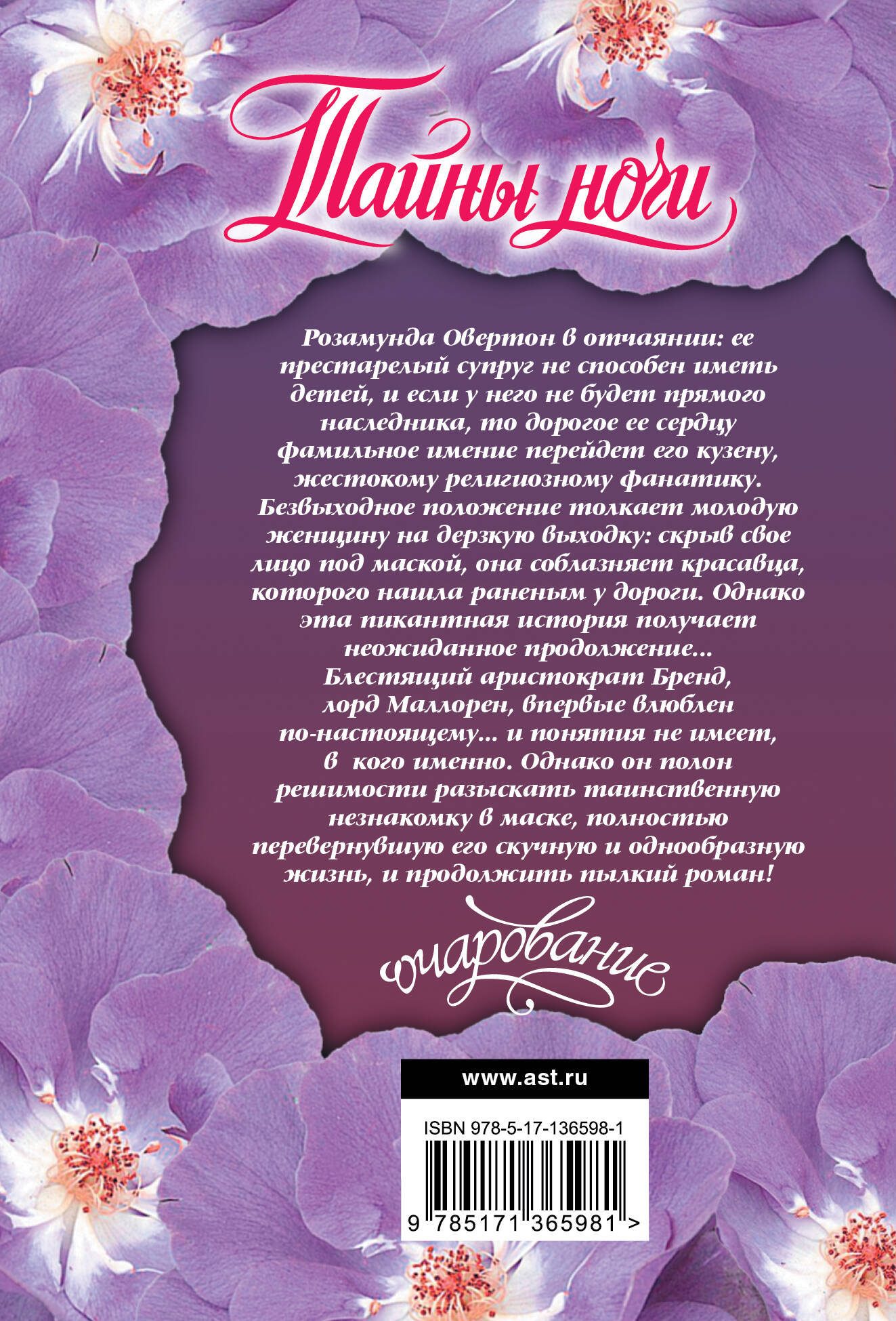 Розамунда Овертон в отчаянии: ее престарелый супруг не способен иметь детей, и если у него не будет прямого наследника, то дорогое ее сердцу фамильное имение перейдет его кузену, жестокому религиозному фанатику. Безвыходное положение толкает молодую женщину на дерзкую выходку: скрыв свое лицо под маской, она соблазняет красавца, которого нашла раненым у дороги. Однако эта пикантная история получает неожиданное продолжение... Блестящий аристократ Бренд, лорд Маллорен, впервые влюблен по-настоящему... и понятия не имеет, в кого именно. Однако он полон решимости разыскать таинственную незнакомку в маске, полностью перевернувшую его скучную и однообразную жизнь, и продолжить пылкий роман!| Издательство | ИЗДАТЕЛЬСТВО "АСТ" |