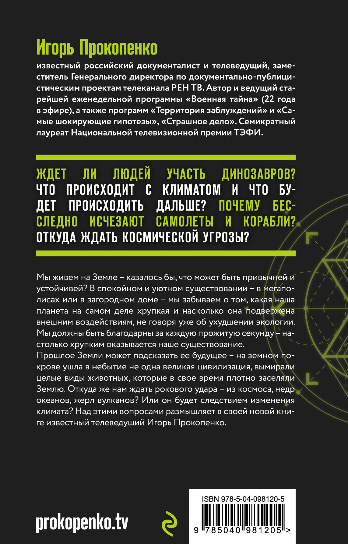 Мы живем на Земле - казалось бы, что может быть привычней и устойчивей? В спокойном и уютном существовании - в мегаполисах или в загородном доме - мы забываем о том, какая наша планета на самом деле хрупкая и насколько она подвержена внешним воздействиям, не говоря уже об ухудшении экологии. Мы должны быть благодарны за каждую прожитую секунду - настолько хрупким оказывается наше существование. Прошлое Земли может подсказать ее будущее - на земном покрове ушла в небытие не одна великая цивилизация, вымирали целые виды животных, которые в свое время плотно заселяли Землю. Откуда же нам ждать рокового удара - из космоса, недр океанов, жерл вулканов? Или он будет следствием изменения климата? Над этими вопросами размышляет в своей новой книге известный телеведущий Игорь Прокопенко.| Издательство | ООО "Издательство "Эксмо" |