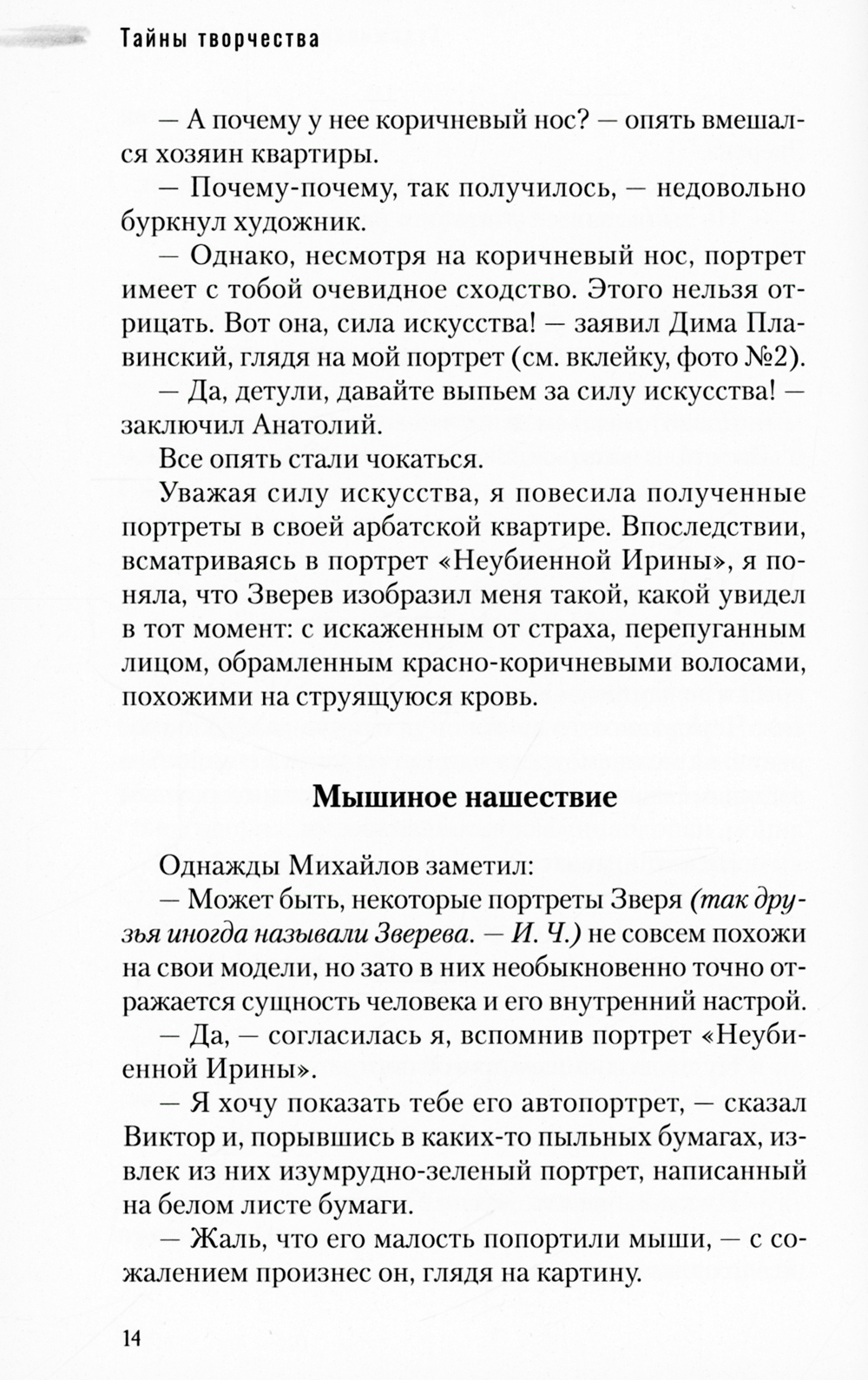 В этой книге речь идет о художниках, оставивших свой след в истории искусства, таких как Зверев, Плавинский, Жуковский, Дора Маар и другие. Ирина Ченакал рассказывает о некоторых секретах их творчества и о процессе создания произведений, при которых она присутствовала, а также о музах и моделях, вдохновлявших художников.