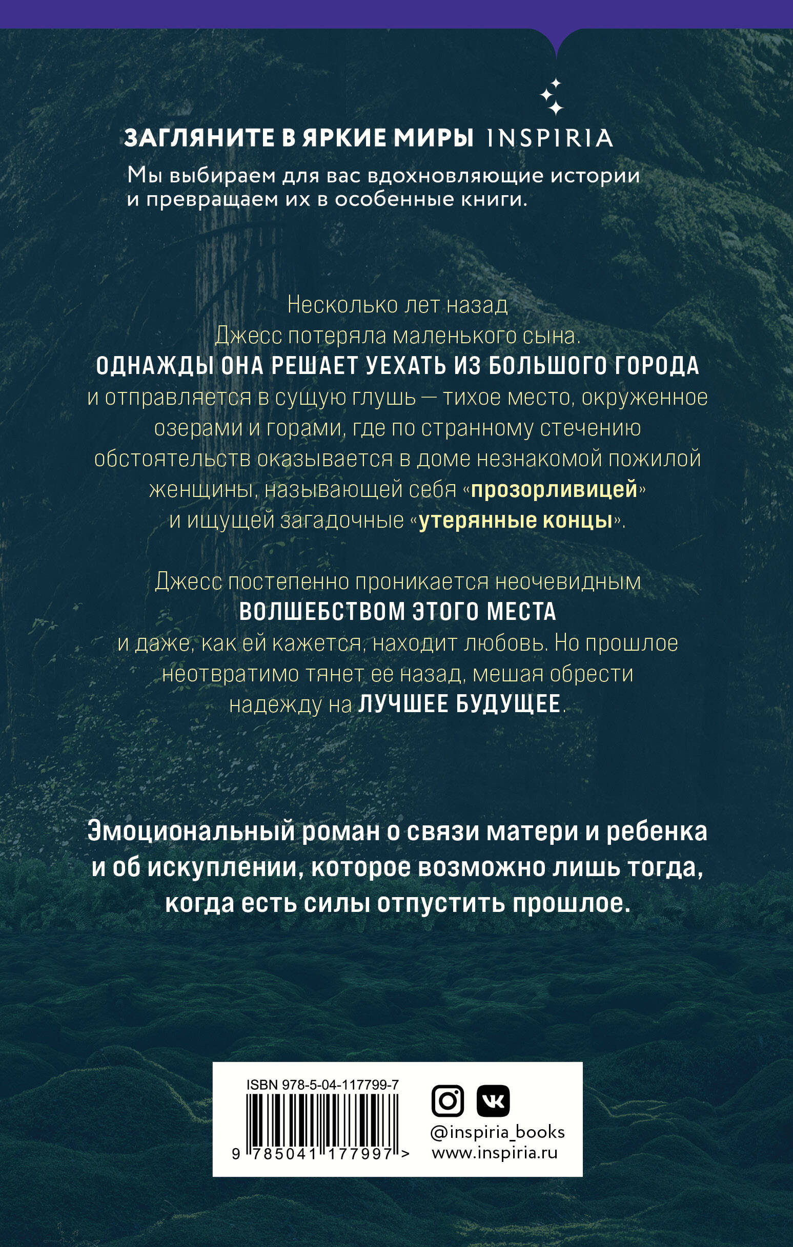 Несколько лет назад Джесс потеряла маленького сына. Однажды она срывается из большого города и едет в сущую глушь - тихое место, окруженное озерами и горами, где по странному стечению обстоятельств оказывается в доме незнакомой пожилой женщины, называющей себя «прозорливицей» и ищущей загадочные «утерянные концы». Джесс постепенно проникается неочевидным волшебством своего нового дома и даже, как ей кажется, находит любовь. Но прошлое неотвратимо тянет ее назад, мешая обрести веру в добро и лучшее будущее. Мелисса Пейн создала красивый, загадочный и немного меланхоличный мир, которого иногда очень не хватает на контрасте с нашей прозаичной реальностью. Прекрасный образец магического реализма и романтической прозы.| Издательство | ООО "Издательство "Эксмо" |