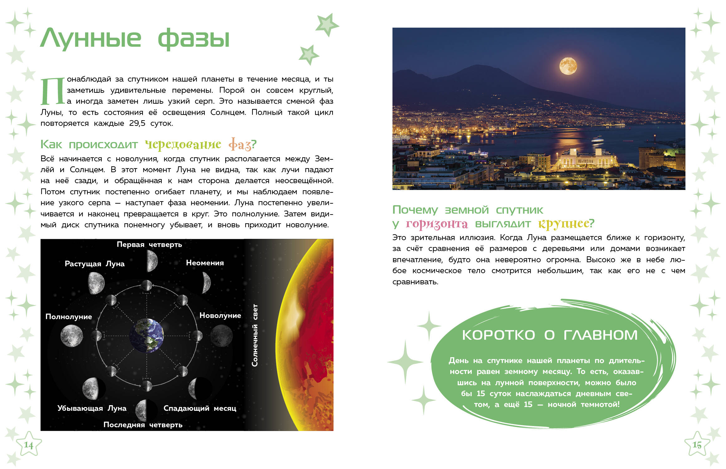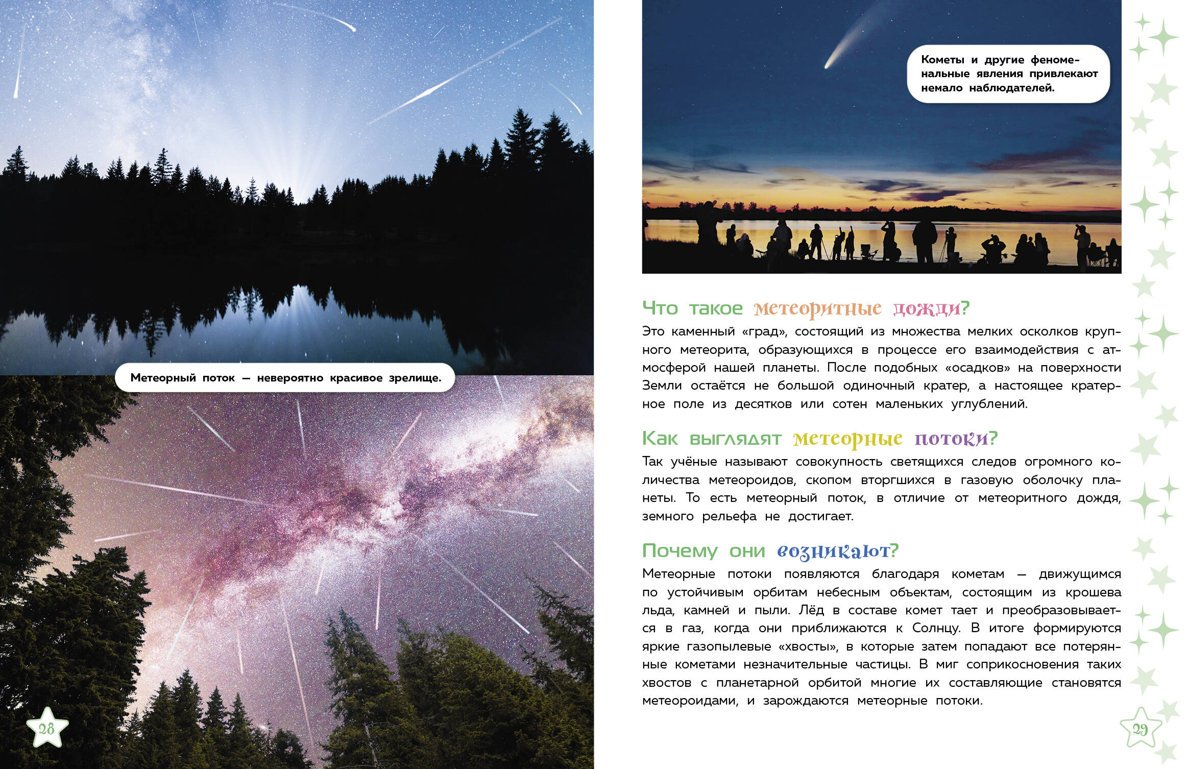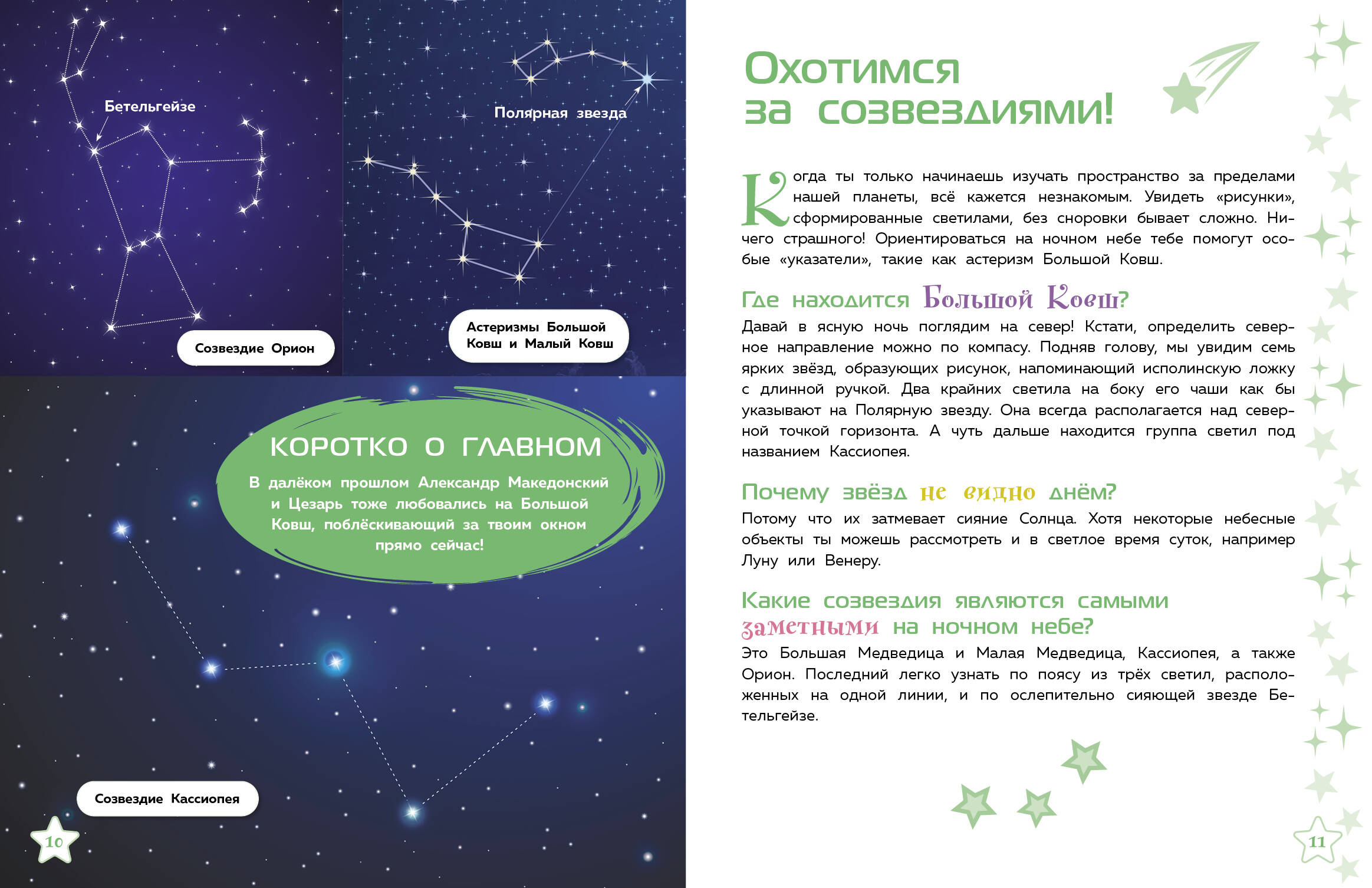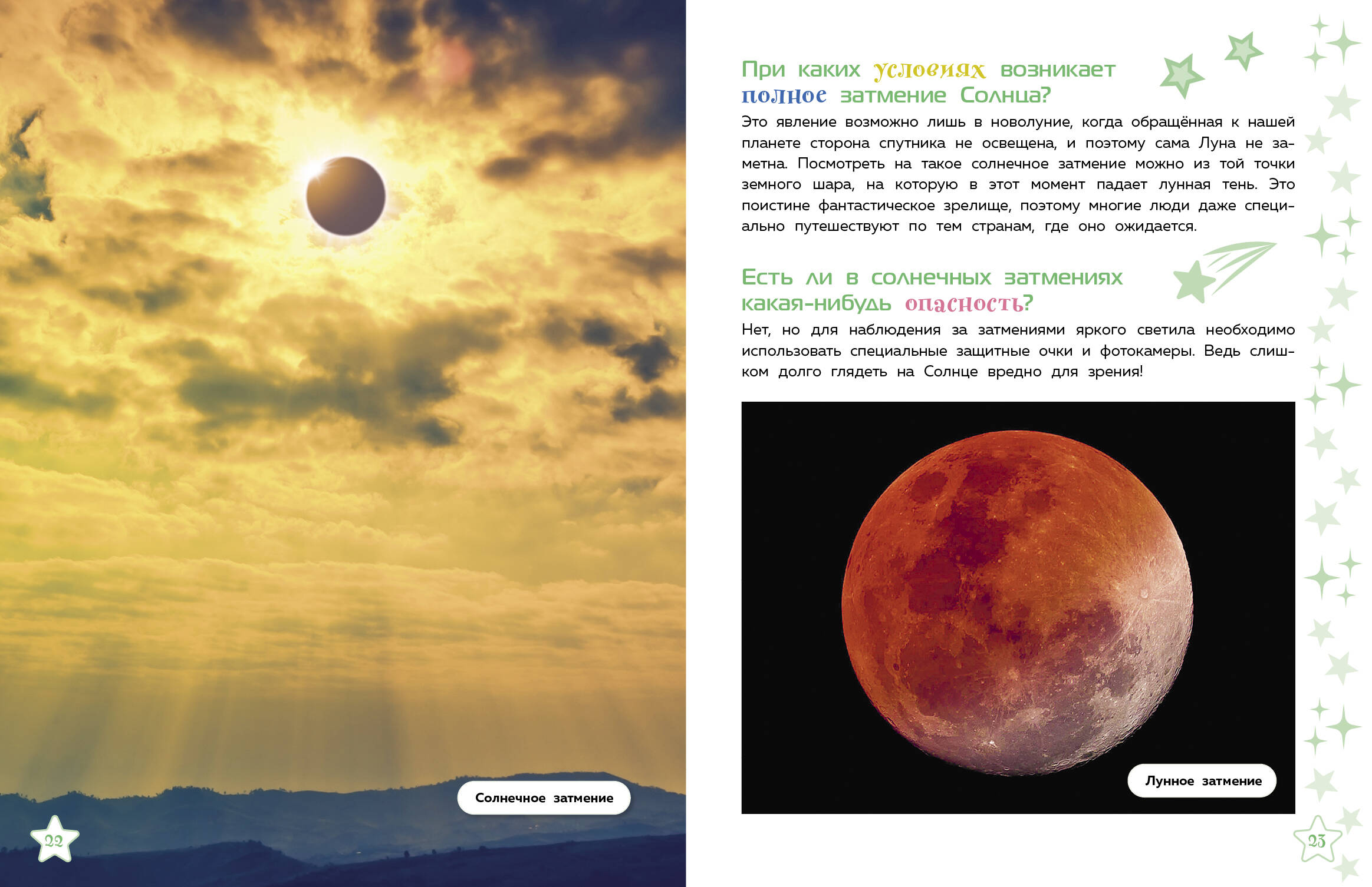Внимание! Мы отправляемся наблюдать за ночным (и не только!) небом! Если ты хочешь узнать всё самое увлекательное о явлениях и объектах, видимых с Земли, то давай с нами! Будет космически интересно! Мы отправимся на север, чтобы полюбоваться полярным сиянием, будем путешествовать по планете и в нужный час увидим солнечное и лунное затмения, понаблюдаем за метеорным потоком и меняющимися фазами Луны, исследуем звёздное небо и найдём Большой Ковш. И это не всё! Мы побываем в Антарктике и обнаружим там осколки метеоритов, полюбуемся удивительными оттенками, которые появляются на закате благодаря Солнцу… В пути нас ждёт ещё много всего захватывающего!