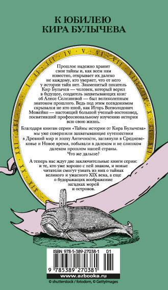 Прошлое надежно хранит свои тайны и, как всем нам известно, открывает их далеко не каждому, кто уверяет, что от него у истории тайн нет. Знаменитый писатель Кир Булычев - человек, который верил в будущее, создатель захватывающих книг об Алисе Селезневой - был великолепным знатоком прошлого. Ведь под этим псевдонимом скрывался не кто иной, как Игорь Всеволодович Можейко - настоящий большой ученый-востоковед, посвятивший профессиональному изучению истории всю свою жизнь. "Я написал уже несколько книг о тайнах истории. А раз это исторические книги, то и писались они по очереди - сначала "Тайны Древнего мира", затем "Тайны античного мира" и так далее... Я добрался почти до прошлого века и тут понял, что не все случаи, о которых хочется рассказать, укладываются в эту схему" - так начинается книга Игоря Всеволодовича Можейко "Тайны морей и островов". Благодаря книгам серии "Тайны истории от Кира Булычева" мы уже совершили захватывающие путешествия в Древний мир и эпоху Античности, заглянули в Средневековье и Новое время, побывали в далеком и не слишком далеком прошлом нашей страны. Что же дальше? А теперь нас ждут две заключительные книги серии: и те, кто уже хорошо с ней знаком, и новые читатели смогут узнать из них о тайнах великого и ужасного XIX века, а еще о будоражащих воображение загадках морей и островов. Наша новая захватывающая экскурсия в историю человечества начинается прямо сейчас!| Издательство | Азбука-Аттикус Издат.группа ООО |