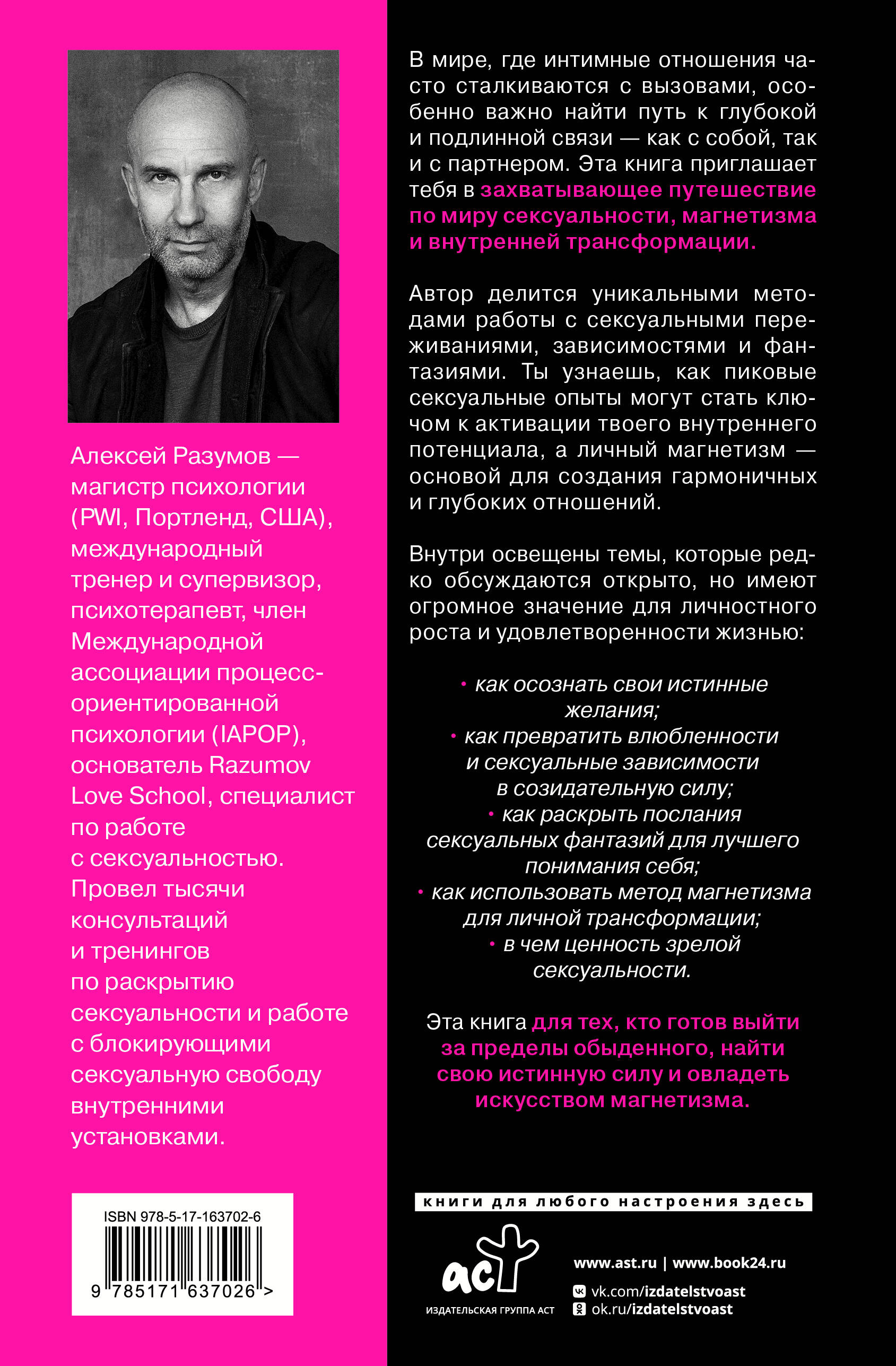 Алексей Разумов - магистр психологии (PWI, Портленд, США), международный тренер и супервизор, психотерапевт, член Международной ассоциации процесс-ориентированной психологии (IAPOP), основатель Razumov Love School, специалист по работе с сексуальностью. Провел тысячи консультаций и тренингов по раскрытию сексуальности и работе с блокирующими сексуальную свободу внутренними установками. В мире, где интимные отношения часто сталкиваются с вызовами, особенно важно найти путь к глубокой и подлинной связи - как с собой, так и с партнером. Эта книга приглашает тебя в захватывающее путешествие по миру сексуальности, магнетизма и внутренней трансформации. Автор делится уникальными методами работы с сексуальными переживаниями, зависимостями и фантазиями. Ты узнаешь, как пиковые сексуальные опыты могут стать ключом к активации твоего внутреннего потенциала, а личный магнетизм - основой для создания гармоничных и глубоких отношений. Внутри освещены темы, которые редко обсуждаются открыто, но имеют огромное значение для личностного роста и удовлетворенности жизнью: • как осознать свои истинные желания; • как превратить влюбленности и сексуальные зависимости в созидательную силу; • как раскрыть послания сексуальных фантазий для лучшего понимания себя; • как использовать метод магнетизма для личной трансформации; • в чем ценность зрелой сексуальности. Эта книга для тех, кто готов выйти за пределы обыденного, найти свою истинную силу и овладеть искусством магнетизма.| Издательство | Издательство "АСТ" |
