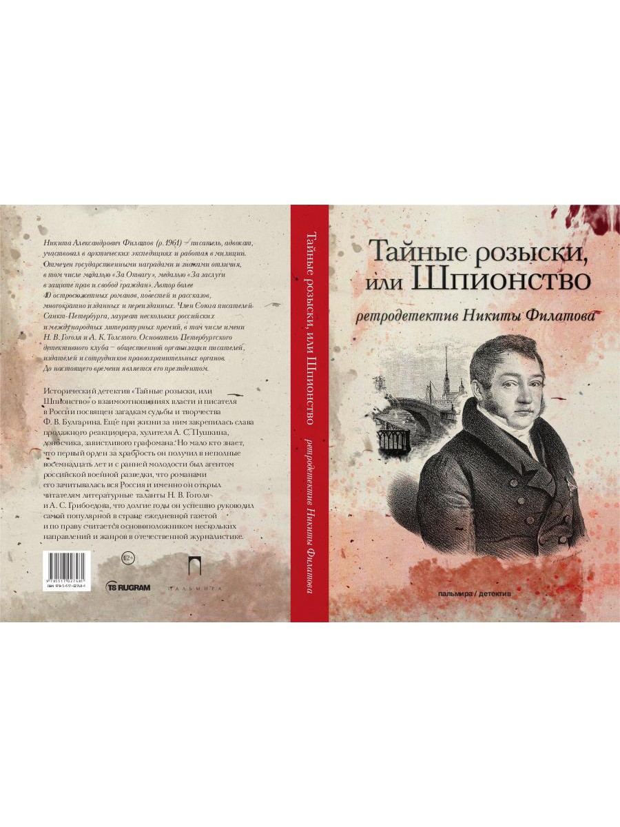 Исторический детектив Н. А. Филатова «Тайные розыски, или Шпионство» о взаимоотношениях власти и писателя в России посвящен загадкам судьбы и творчества Ф. В. Булгарина. Еще при жизни за ним закрепилась слава продажного реакционера, хулителя А. С. Пушкина, доносчика, завистливого графомана. Но мало кто знает, что первый орден за храбрость он получил в неполные восемнадцать лет и с ранней молодости был агентом российской военной разведки, что романами его зачитывалась вся Россия и именно он открыл читателям литературные таланты Н. В. Гоголя и А. С. Грибоедова, что долгие годы он успешно руководил самой популярной в стране ежедневной газетой и по праву считается основоположником нескольких направлений и жанров в отечественной журналистике.| Издательство | Т8 RUGRAM |