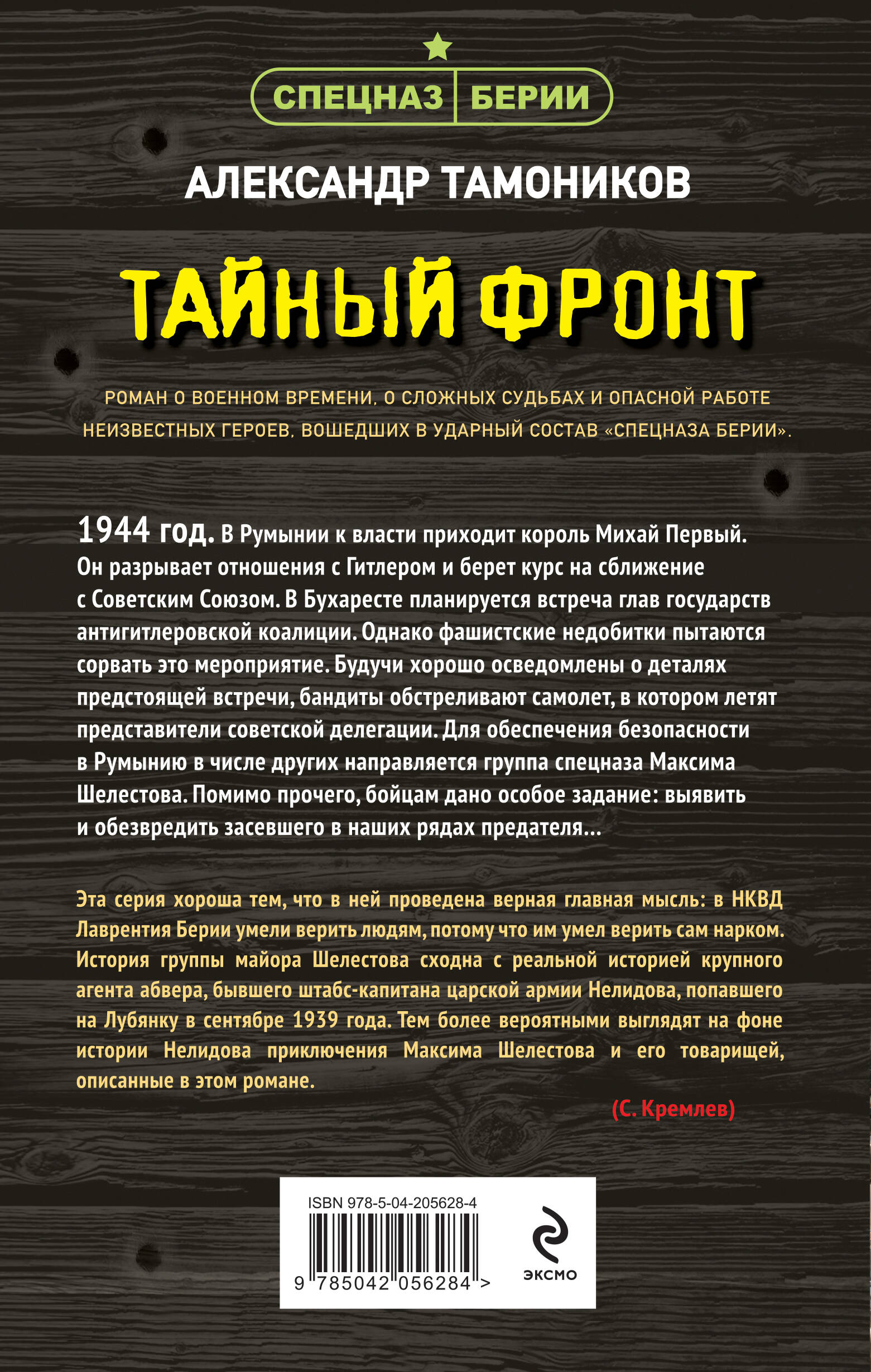 Роман о военном времени, о сложных судьбах и опасной работе неизвестных героев, вошедших в ударный состав «спецназа Берии». 1944 год. В Румынии к власти приходит король Михай Первый. Он разрывает отношения с Гитлером и берет курс на сближение с Советским Союзом. В Бухаресте планируется встреча глав государств антигитлеровской коалиции. Однако фашистские недобитки пытаются сорвать это мероприятие. Будучи хорошо осведомлены о деталях предстоящей встречи, бандиты обстреливают самолет, в котором летят представители советской делегации. Для обеспечения безопасности в Румынию в числе других направляется группа спецназа Максима Шелестова. Помимо прочего, бойцам дано особое задание: выявить и обезвредить засевшего в наших рядах предателя… «Эта серия хороша тем, что в ней проведена верная главная мысль: в НКВД Лаврентия Берии умели верить людям, потому что им умел верить сам нарком. История группы майора Шелестова сходна с реальной историей крупного агента абвера, бывшего штабс-капитана царской армии Нелидова, попавшего на Лубянку в сентябре 1939 года. Тем более вероятными выглядят на фоне истории Нелидова приключения Максима Шелестова и его товарищей, описанные в этом романе». - С. Кремлев Общий тираж книг А. Тамоникова - более 10 миллионов экземпляров.