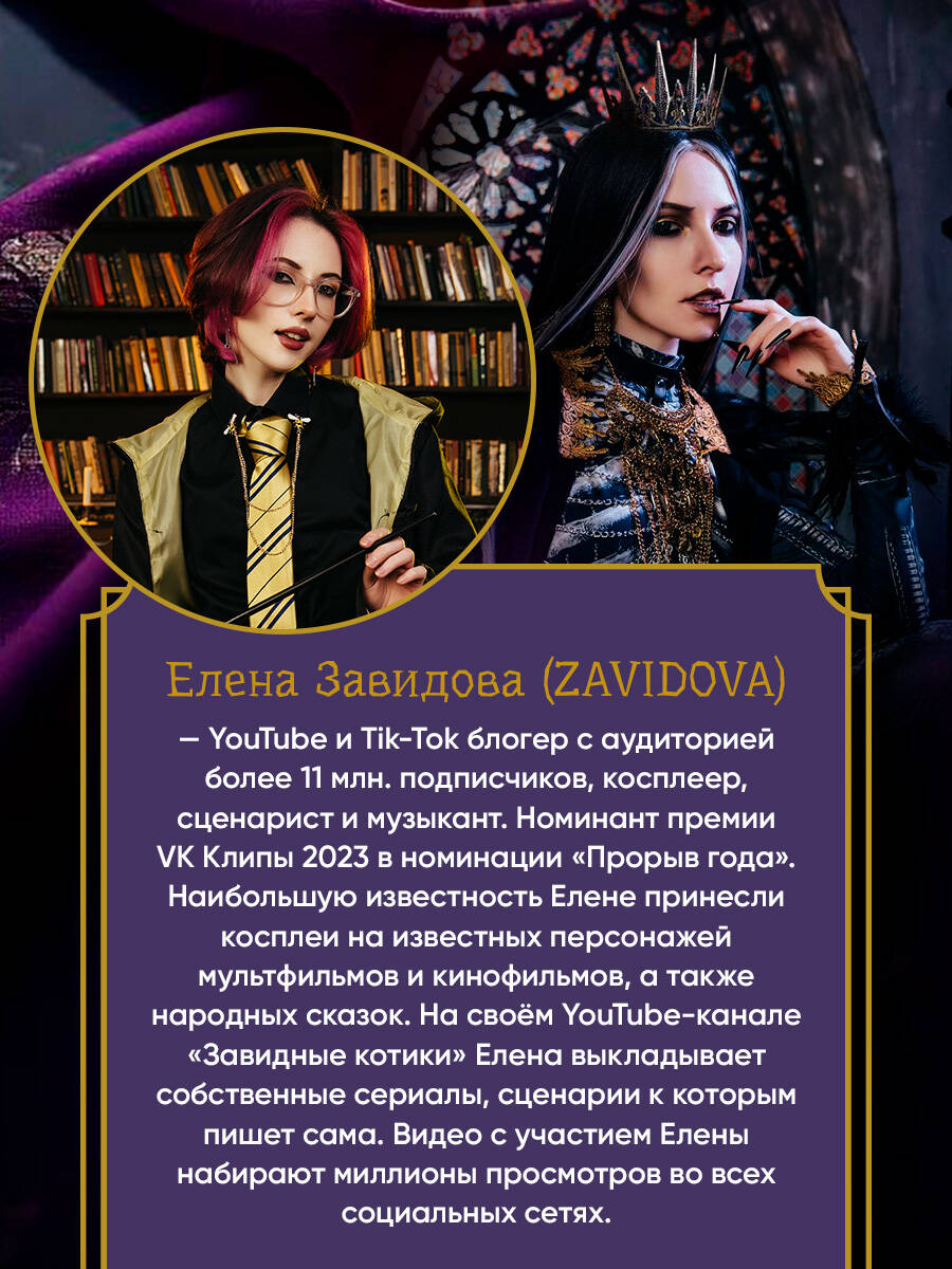 Елена Завидова (ZAVIDOVA) - YouTube и Tik-Tok блогер с аудиторией более 11 млн подписчиков, косплеер, сценарист и музыкант. Наибольшую известность Елене принесли косплеи на известных персонажей мульт- и киновселенных, а также народных сказок. На своём YouTube-канале Елена выкладывает собственные сериалы, сценарии к которым пишет сама. Видео с участием Елены набирают миллионы просмотров во всех социальных сетях. Номинант премии VK Клипы 2023 в номинации «Прорыв года».
