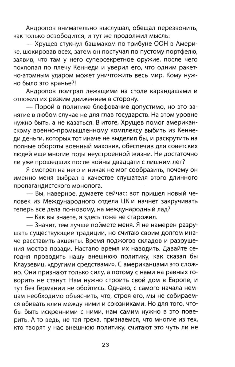 Книга Вячеслава Ервандовича Кеворкова «Тайный канал» раскрывает секреты закулисных переговоров высших руководителей государств. Автор, генерал-майор КГБ, основывается на своём уникальном опыте организации канала секретной связи между руководством Советского Союза и Федеративной Республики Германии в конце 1960-х годов. Читатель узнает подробности подготовки и заключения важнейших международных соглашений, включая московские договоры 1970 года, положившие начало разрядке напряжённости в отношениях Востока и Запада. Рассказывая о конкретных примерах взаимодействия лидеров сверхдержав, автор даёт возможность заглянуть за кулисы большой политики, показать роль тайных каналов коммуникации в мировой истории и представить уникальные свидетельства ключевых исторических моментов второй половиныXX века. Таким образом, книга предлагает уникальную перспективу понимания механизмов принятия решений и роли спецслужб в международной политике, демонстрируя ранее не известные аспекты деятельности государственных деятелей.| Издательство | Родина |