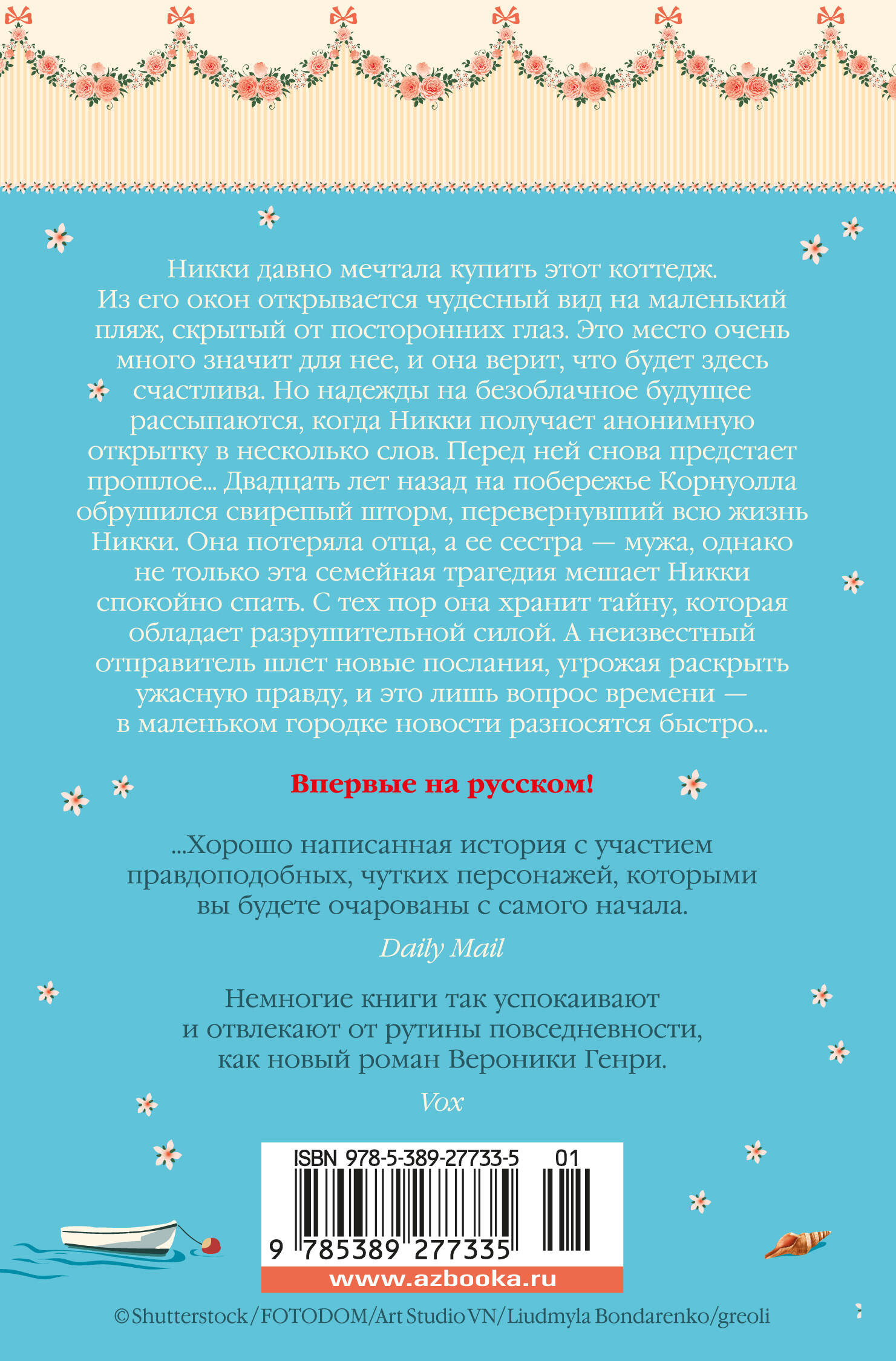 Впервые на русском! В издательстве «Азбука» выходит новый любовный роман Вероники Генри - автора бестселлеров по версии Sunday Times! АННОТАЦИЯ Никки давно мечтала купить этот коттедж. Из его окон открывается чудесный вид на маленький пляж, скрытый от посторонних глаз. Это место очень много значит для нее, и она верит, что будет здесь счастлива. Но надежды на безоблачное будущее рассыпаются, когда Никки получает анонимную открытку в несколько слов. Перед ней снова предстает прошлое... Двадцать лет назад на побережье Корнуолла обрушился свирепый шторм, перевернувший всю жизнь Никки. Она потеряла отца, а ее сестра - мужа, однако не только эта семейная трагедия мешает Никки спокойно спать. С тех пор она хранит тайну, которая обладает разрушительной силой. А неизвестный отправитель шлет новые послания, угрожая раскрыть ужасную правду, и это лишь вопрос времени - в маленьком городке новости разносятся быстро... Книгу по достоинству оценят поклонники ромкомов всех возрастов. В романе найдется увлекательная история любви для каждого поколения! Книги Вероники Генри переведены на 25 языков; суммарный тираж составляет более 2 500 000 экземпляров.| Издательство | Издательство АЗБУКА ООО |