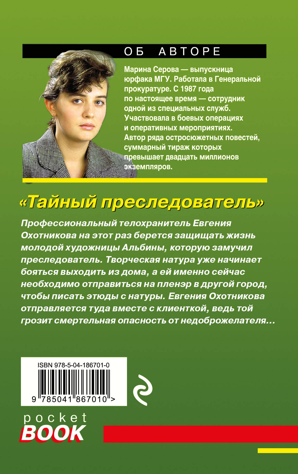 Профессиональный телохранитель Евгения Охотникова на этот раз берется защищать жизнь молодой художницы Альбины, которую замучил преследователь. Творческая натура уже начинает бояться выходить из дома, а ей именно сейчас необходимо отправиться на плэнер в другой город, чтобы писать этюды с натуры. Евгения Охотникова отправляется туда вместе с клиенткой, ведь той грозит смертельная опасность от недоброжелателя… Марина Серова - феномен современного отечественного детективного жанра. Выпускница юрфака МГУ, работала в Генеральной прокуратуре. С 1987 года по настоящее время - сотрудник одной из специальных служб. Участвовала в боевых операциях и оперативных мероприятиях. Автор ряда остросюжетных повестей, суммарный тираж которых превышает двадцать миллионов экземпляров.| Издательство | ООО "Издательство "Эксмо" |