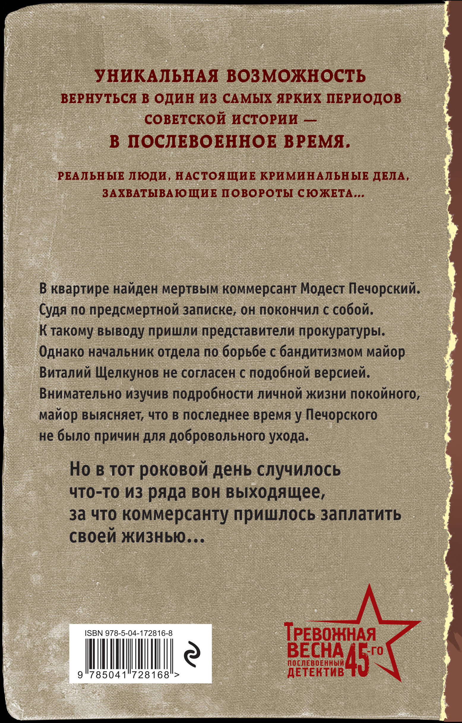 В квартире найден мертвым коммерсант Модест Печорский. Судя по предсмертной записке, он покончил собой. К такому выводу пришли представители прокуратуры. Однако начальник отдела по борьбе с бандитизмом майор Виталий Щелкунов не согласен с подобной версией. Внимательно изучив подробности личной жизни покойного, майор выясняет, что в последнее время у Печорского не было причин для добровольного ухода. Но в тот роковой день случилось что-то из ряда вон выходящее, за что коммерсанту пришлось заплатить своей жизнью… Уникальная возможность вернуться в один из самых ярких периодов советской истории - в послевоенное время. Реальные люди, настоящие криминальные дела, захватывающие повороты сюжета. Персонажи, похожие на культовые образы фильма «Место встречи изменить нельзя». Дух времени, трепетно хранящийся во многих семьях. Необычно и реалистично показанная «кухня» повседневной работы советской милиции.| Издательство | ООО "Издательство "Эксмо" |