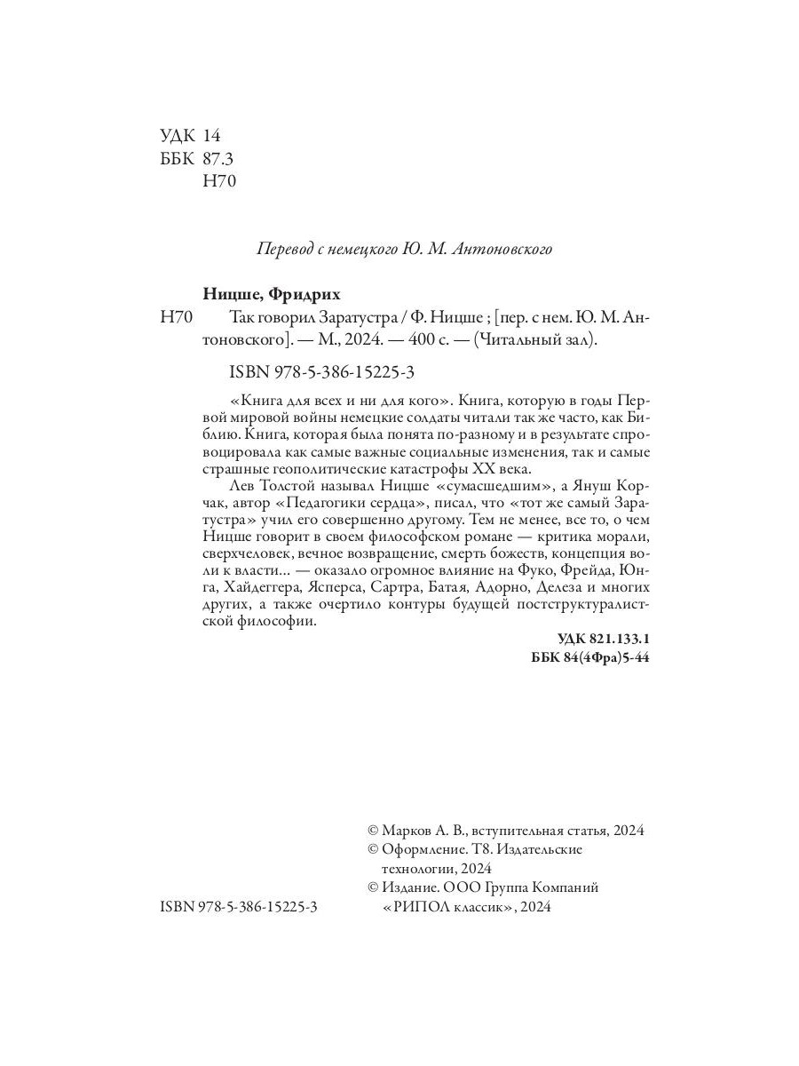 «Книга для всех и ни для кого». Книга, которую в годы Первой мировой войны немецкие солдаты читали так же часто, как Библию. Книга, которая была понята по-разному и в результате спровоцировала как самые важные социальные изменения, так и самые страшные геополитические катастрофы XX века. Лев Толстой называл Ницше «сумасшедшим», а Януш Корчак, автор «Педагогики сердца», писал, что «тот же самый Заратустра» учил его совершенно другому. Тем не менее, все то, о чем Ницше говорит в своем философском романе - критика морали, сверхчеловек, вечное возвращение, смерть божеств, концепция воли к власти… - оказало огромное влияние на Фуко, Фрейда, Юнга, Хайдеггера, Ясперса, Сартра, Батая, Адорно, Делеза и многих других, а также очертило контуры будущей постструктуралистской философии.| Издательство | Рипол Классик |