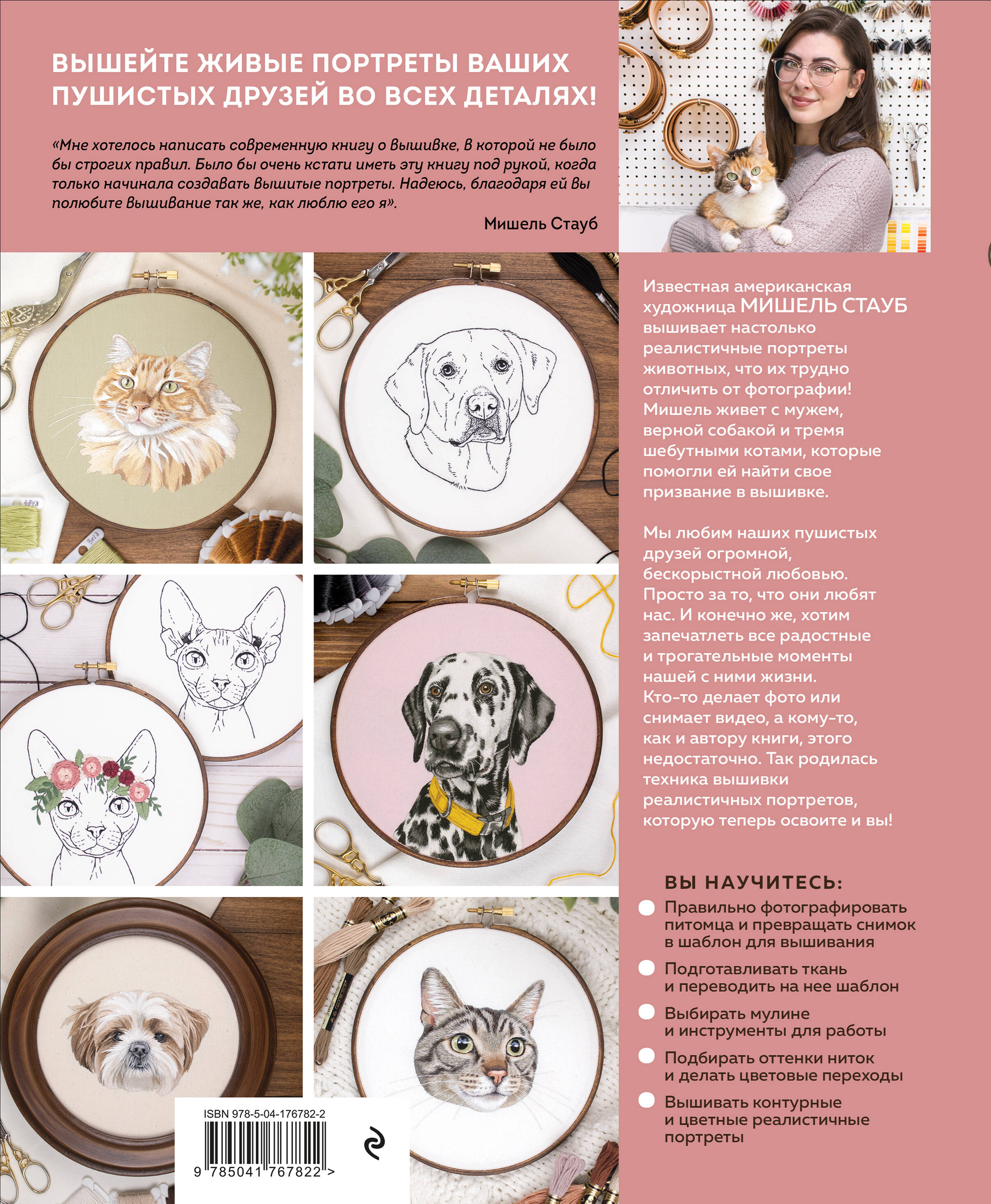 Вышейте живые портреты ваших пушистых друзей во всех деталях! Известная американская художница Мишель Стауб впервые делится секретами создания потрясающих реалистичных портретов животных! Мы любим наших четвероногих друзей огромной, необъятной любовью. Стараемся проводить с ними побольше времени и, конечно же, хотим запечатлеть все радостные и трогательные моменты нашей с ними жизни. Кто-то делает фото или снимает видео, а кому-то, как и автору книги, этого недостаточно. Так родилась техника вышивки реалистичных портретов, которую теперь освоите и вы! Вы научитесь: • Правильно фотографировать питомца и превращать снимок в шаблон для вышивания. • Подготавливать ткань и переводить на нее шаблон. • Выбирать мулине и инструменты для работы. • Подбирать оттенки ниток и делать цветовые переходы. • Вышивать контурные и цветные реалистичные портреты.