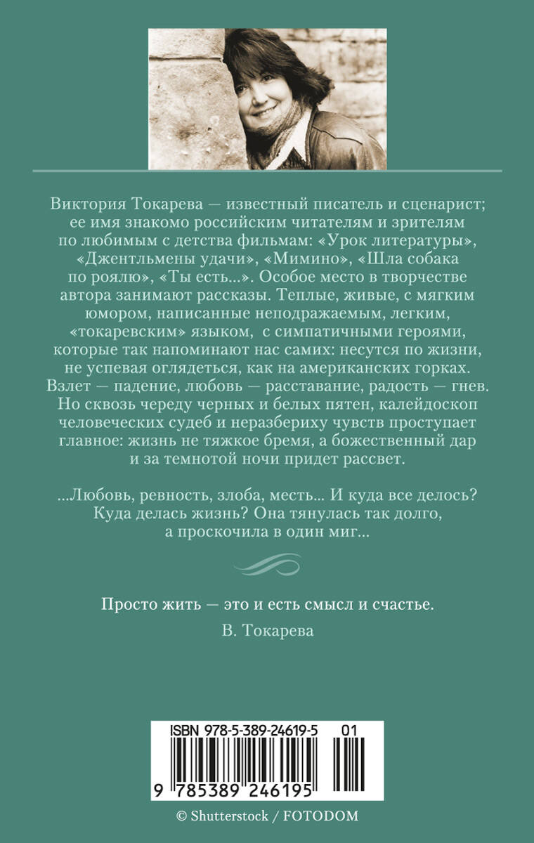 Виктория Токарева - известный писатель и сценарист; ее имя знакомо российским читателям и зрителям по любимым с детства фильмам: "Урок литературы", "Джентльмены удачи", "Мимино", "Шла собака по роялю", "Ты есть...". Особое место в творчестве автора занимают повести и рассказы. Теплые, живые, с мягким юмором, написанные неподражаемым, легким, "токаревским" языком, с симпатичными героями, которые порой напоминают нас самих: несутся по жизни, не успевая оглядеться, как на американских горках. Взлет - падение, любовь - расставание, радость - гнев. Но сквозь череду черных и белых пятен, калейдоскоп человеческих судеб и неразбериху чувств проступает главное: жизнь не тяжкое бремя, а божественный дар и за темнотой ночи придет рассвет. В издание вошли прозаические произведения Виктории Токаревой, включая рассказы "Так плохо, как сегодня", "Чужие проблемы", "Сволочей тоже жалко", "Странности любви", повесть "Случайная связь" и др.