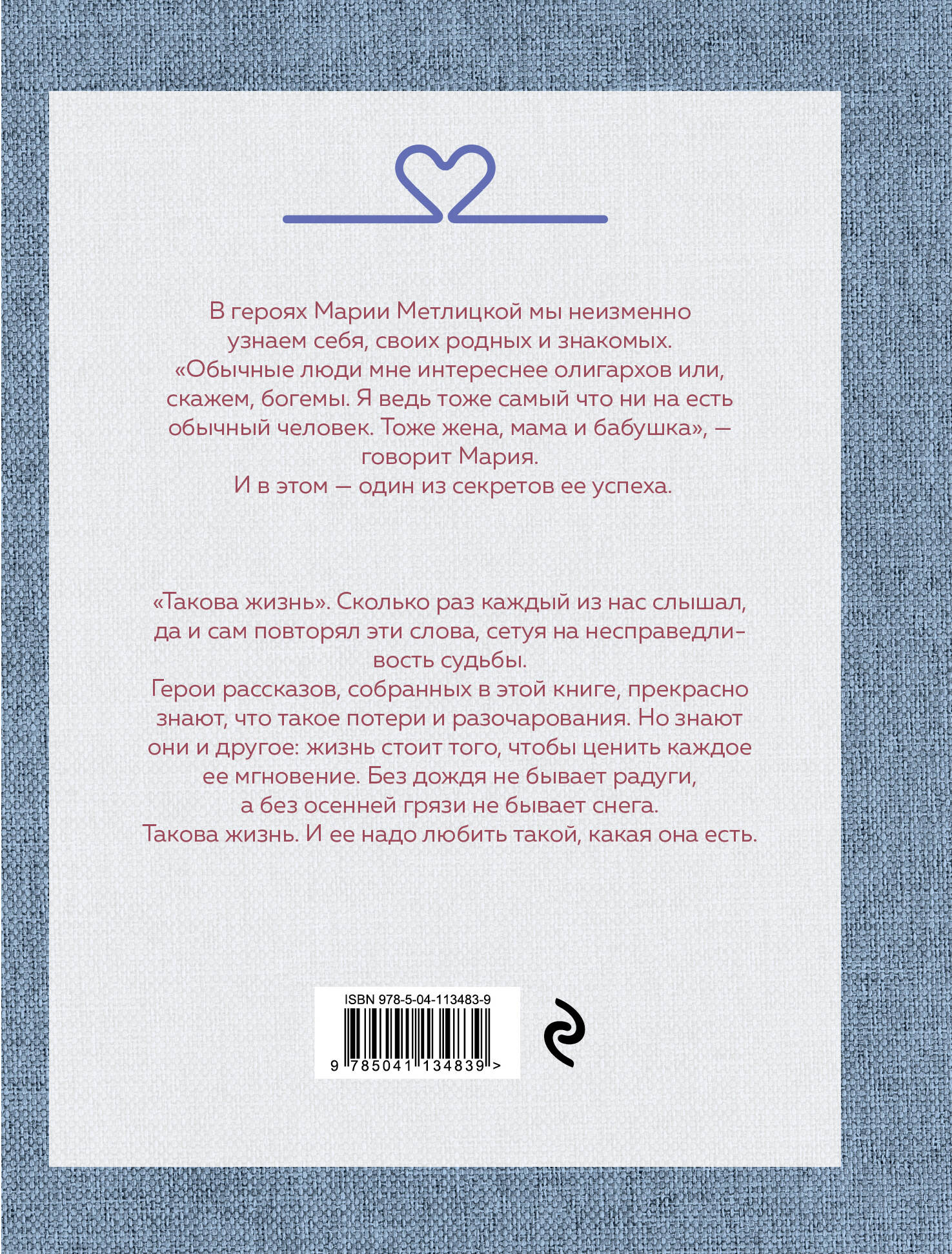 Мария Метлицкая показывает нам «маленькую жизнь» негромких людей - в ее героях мы узнаем себя, своих родных и знакомых. «Обычные люди мне интереснее олигархов или, скажем, богемы. Я ведь тоже - самый что ни на есть обычный человек. Живу такой же жизнью, что и вы. Я тоже жена, мама и бабушка», - говорит Мария. И в этом - один из секретов ее успеха. Ее рассказы примиряют с трудностями и дают надежду на счастье. «Такова жизнь». Сколько раз каждый из нас слышал, да и сам повторял эти слова, сетуя на несправедливость судьбы, невозможность что-либо в ней изменить. Герои рассказов, собранных в этой книге, прекрасно знают, что такое потери, разочарования, предательство. Но знают они и другое: жизнь стоит того, чтобы ценить каждое ее мгновение. Невозможно прожить без трудностей и проблем. Но без дождя не бывает радуги, без осенней грязи не бывает белоснежного снега. Черная полоса обязательно сменяется белой. Такова жизнь. И ее надо любить такой, какая она есть.| Издательство | ООО "Издательство "Эксмо" |