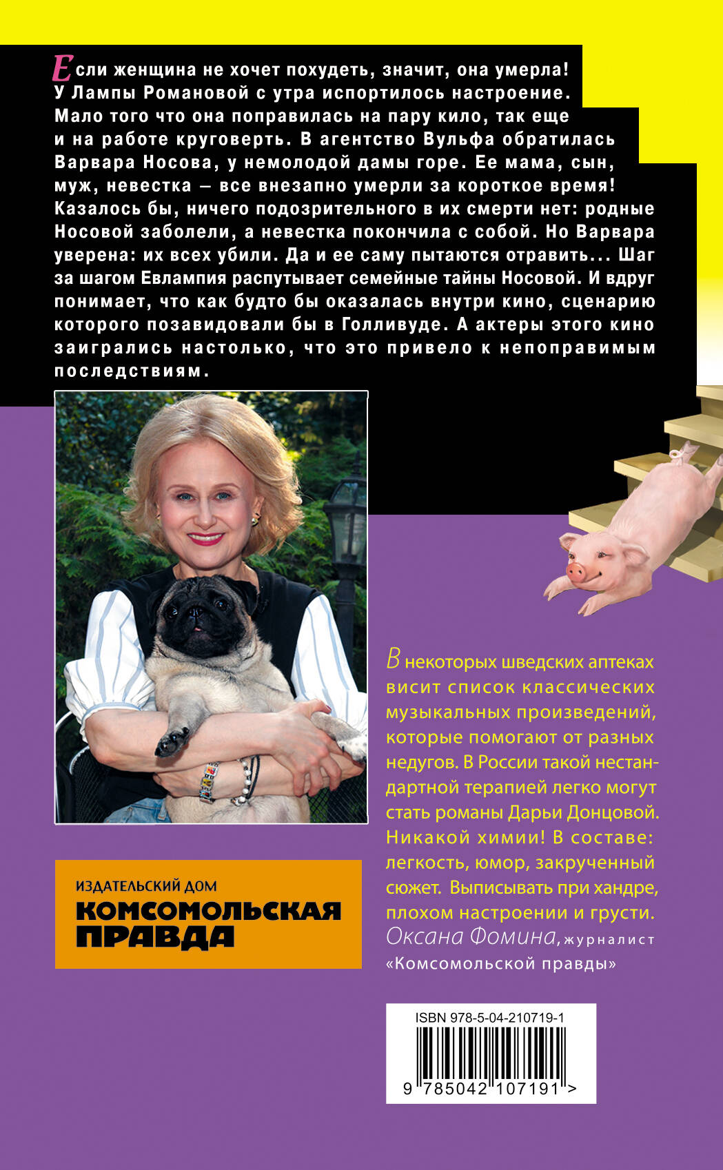 Если женщина не хочет похудеть, значит, она умерла! У Лампы Романовой с утра испортилось настроение. Мало того, что она поправилась на пару кило, так еще и на работе круговерть. В агентство Вульфа обратилась Варвара Носова, у немолодой дамы горе. Ее мама, сын, муж, невестка, все внезапно умерли за короткое время! Казалось бы, ничего подозрительного в их смерти нет: родные Носовой заболели, а невестка покончила с собой. Но Варвара уверена: их всех убили. Да и ее саму пытаются отравить... Шаг за шагом Евлампия распутывает семейные тайны Носовой. И вдруг понимает, что как будто бы оказалась внутри кино, сценарию которого позавидовали бы в Голливуде. А актеры этого кино заигрались настолько, что это привело к непоправимым последствиям. Дарья Донцова - самый популярный и востребованный автор в нашей стране, любимица миллионов читателей. В России продано более 200 миллионов экземпляров ее книг. Ее творчество наполняет сердца и души светом, оптимизмом, радостью, уверенностью в завтрашнем дне! «Донцова невероятная работяга! Я не знаю ни одного другого писателя, который столько работал бы. Я отношусь к ней с уважением, как к образцу писательского трудолюбия. Женщины нуждаются в психологической поддержке и получают ее от Донцовой. Я и сама в свое время прочла несколько романов Донцовой. Ее читают очень разные люди. И очень занятые бизнес-леди, чтобы на время выключить голову, и домохозяйки, у которых есть перерыв 15-20 минут между отвести-забрать детей». - Галина Юзефович, литературный критик| Издательство | ООО "Издательство "Эксмо" |